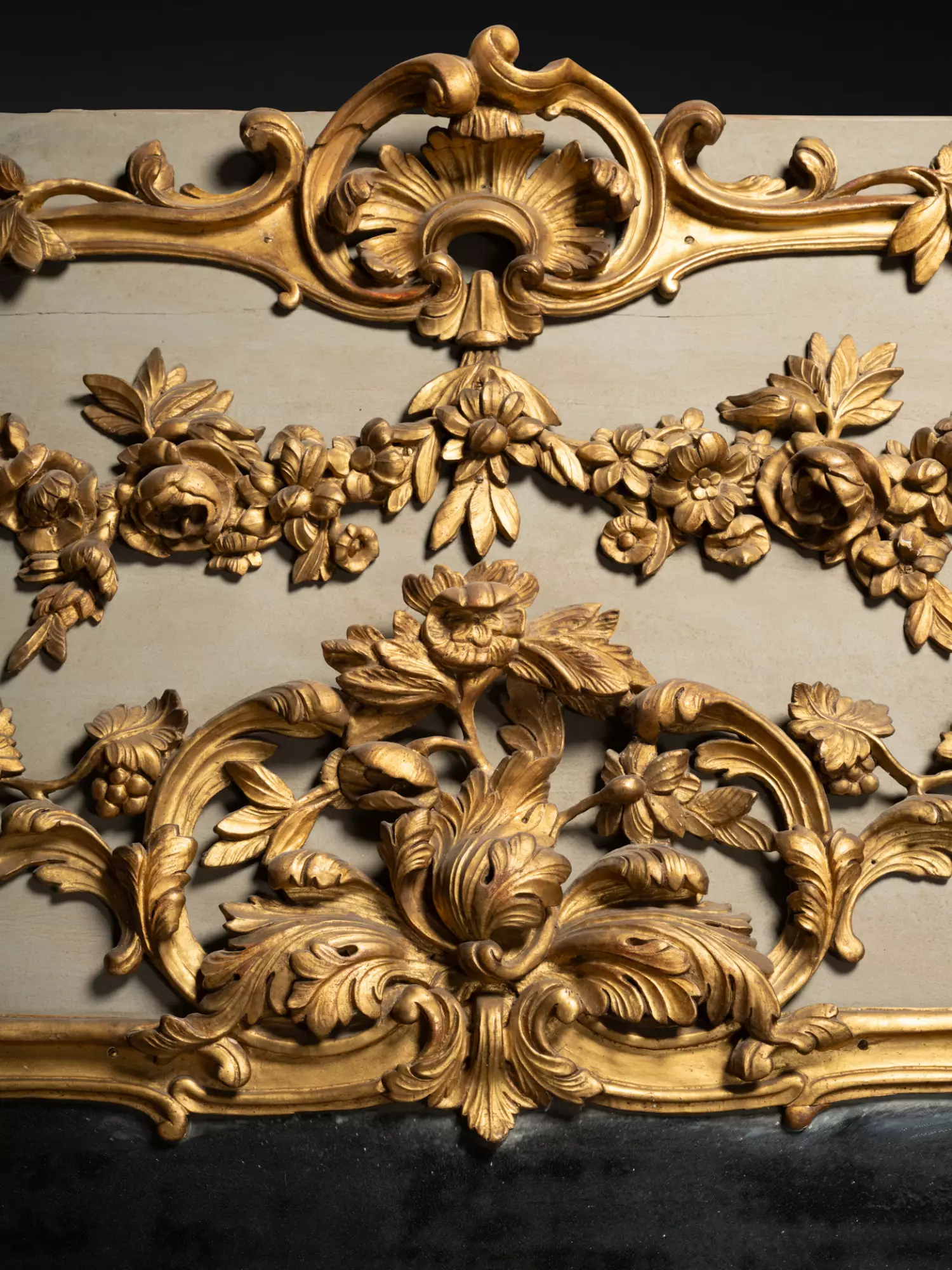 La traverse haute arbore une large feuille d’acanthe déployée surmontée d’une réserve constituée d’agrafes d’achantes entrelacées de branchages sur un fond de boiserie, avec au centre une guirlande de roses suspendue par des anneaux.