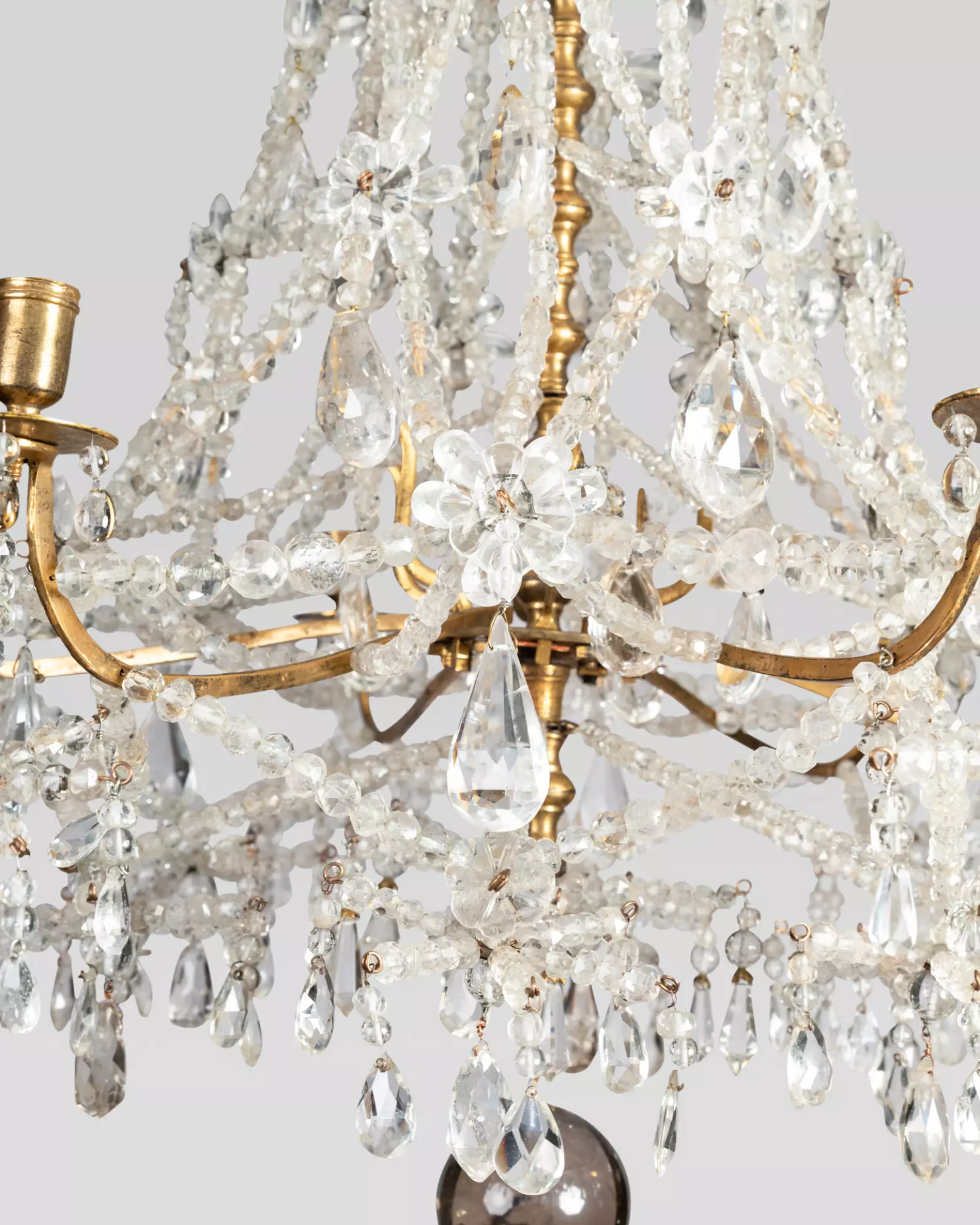 L’ensemble est relié par un treillis métallique à lacets garnis de perles en cristal de roche, en forme de poire , de rosaces, d’oves torsadées…