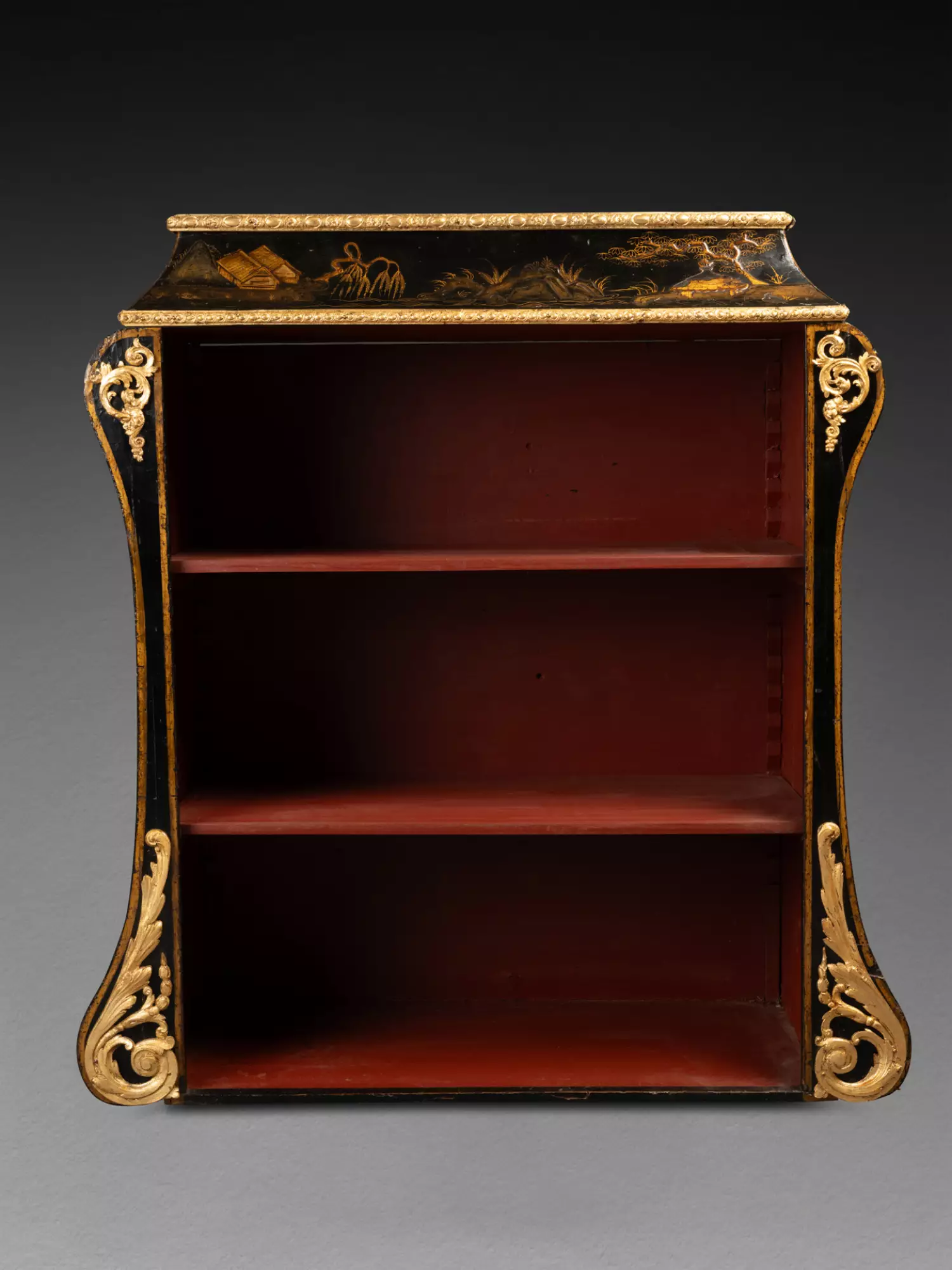 Rare cartonnier de forme rectangulaire avec des côtés légèrement galbés et une corniche haute en doucine renversée. Les côtés et la partie haute sont ornés d’un décor en fort relief en laque européenne de type vernis Martin, avec des pagodes et des personnages en habits traditionnels dans un environnement lacustre, réalisé à la poudre d’or sur un fond de laque noire. L’intérieur en laque rouge vermillon présente deux étagères.