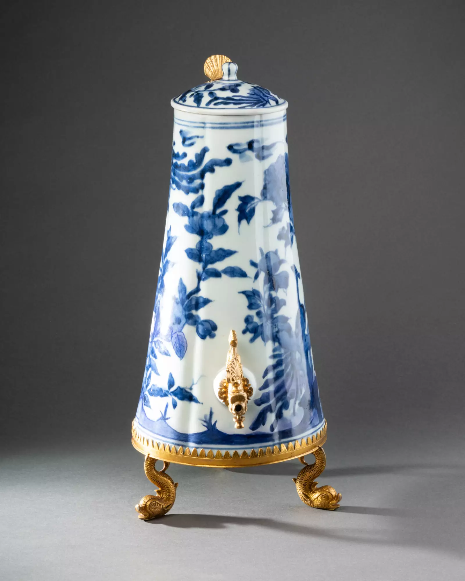 La fontaine de forme cylindrique est coiffée de son couvercle, l’ensemble présente un très beau décor bleu au cobalt sous glaçure et sur fond blanc de phœnix dans un environnement de branches de pivoines et de tertres rocailleux. Une riche monture en bronze finement ciselé et doré agrémente la porcelaine, elle comprend un socle supporté par quatre dauphins, un robinet en forme de monstre marin et une prise d’ouverture du couvercle à décor de coquillage et de lion cabré.
