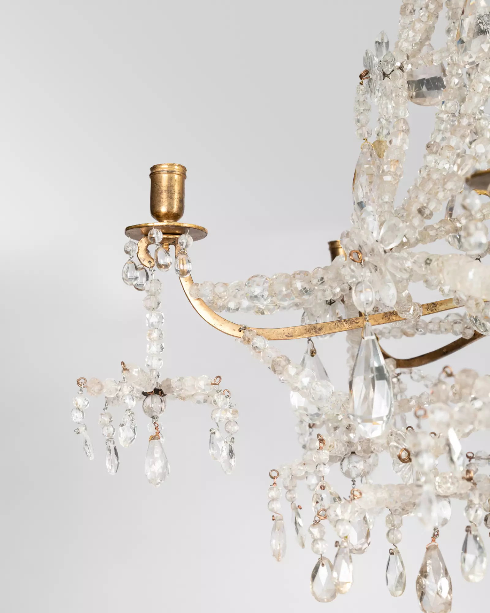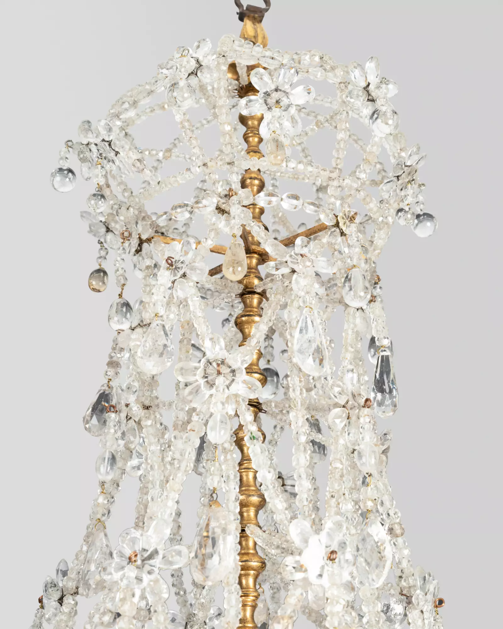 L’ensemble est relié par un treillis métallique à lacets garnis de perles en cristal de roche, en forme de poire , de rosaces, d’oves torsadées…