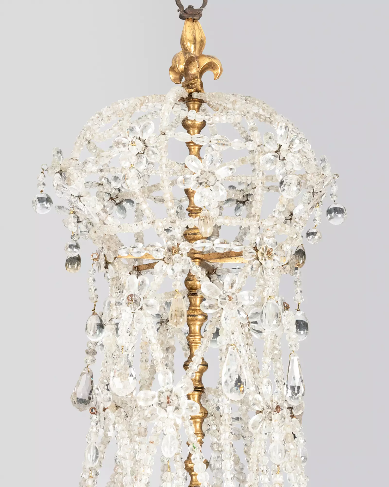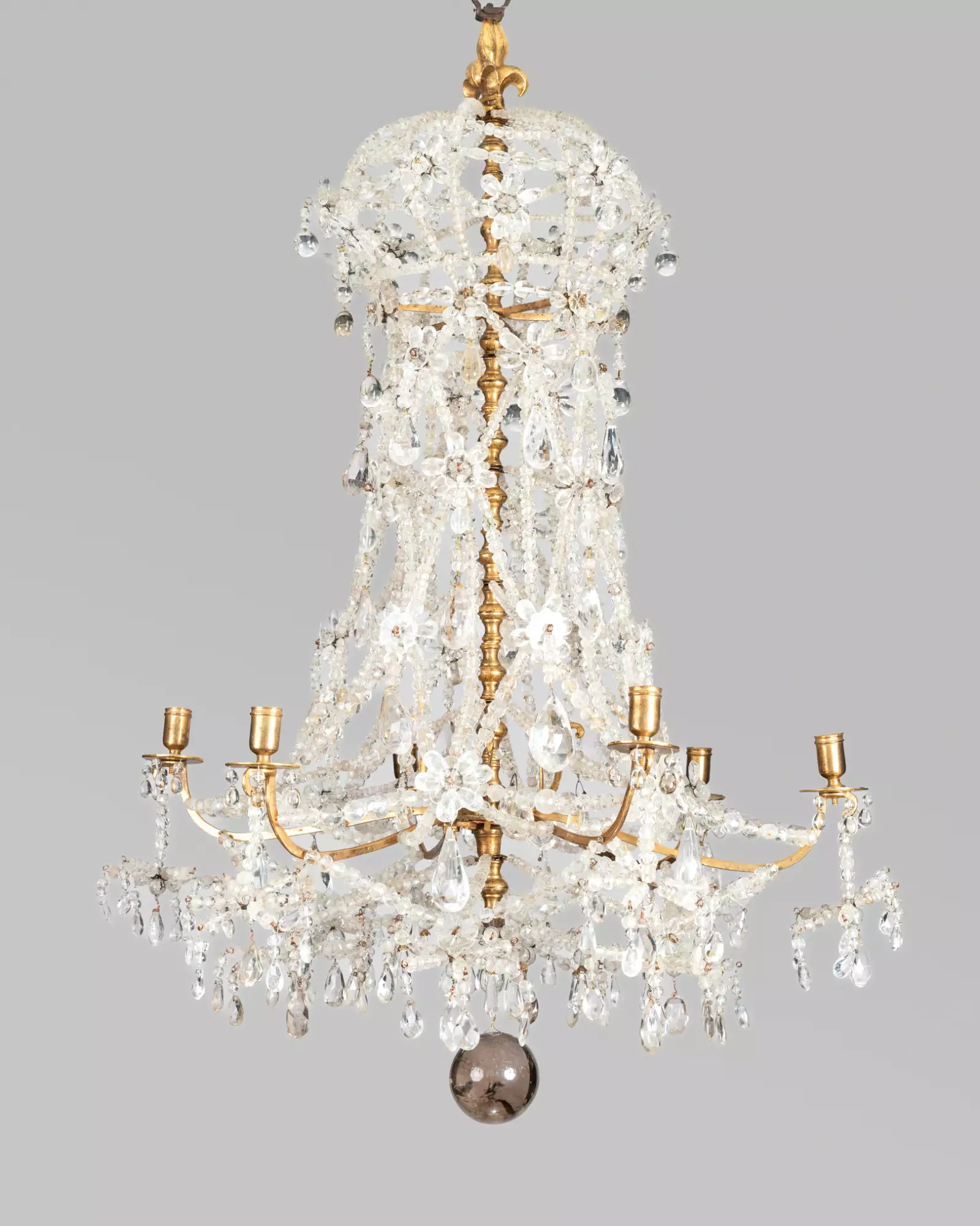 La sublime fleur de lys qui coiffe notre lustre nous renvoie très certainement à une production destinée à la couronne.