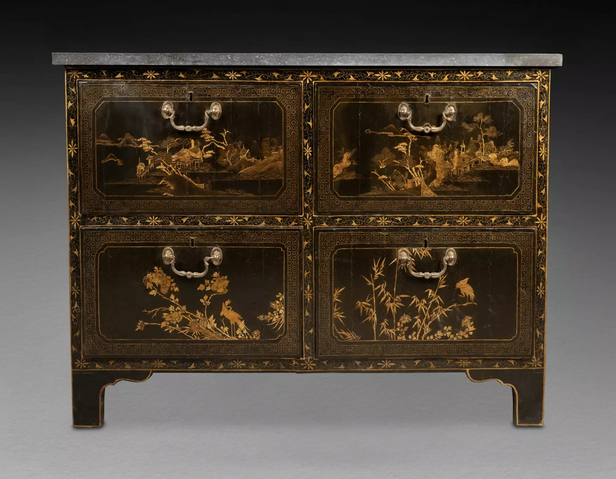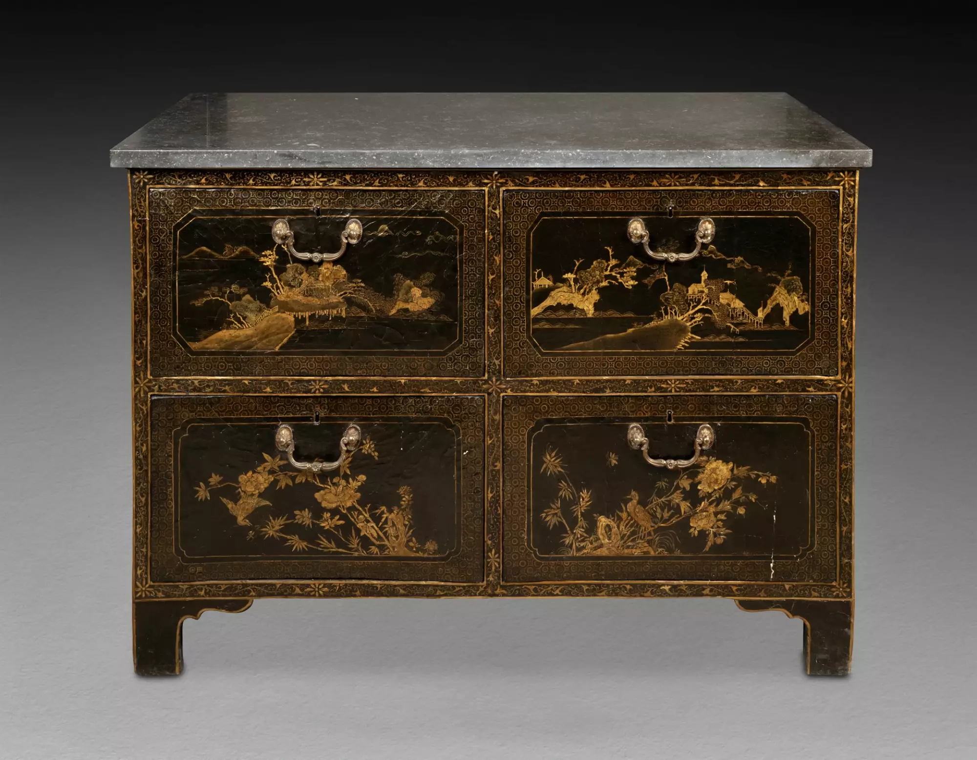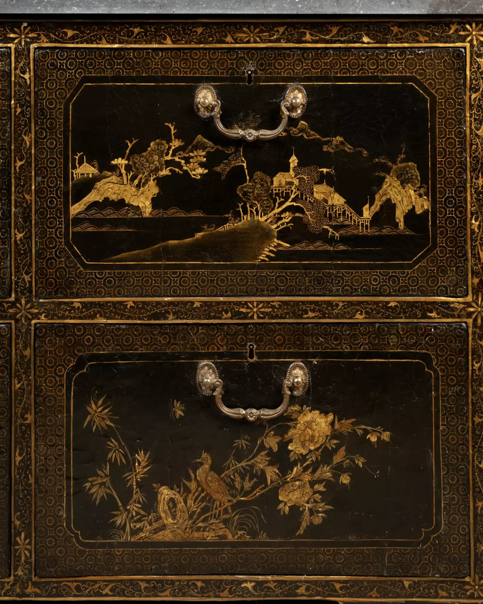 Les panneaux présents sur notre commode proviennent d’un grand paravent réalisé en Chine, dans les ateliers de la ville de Canton, pour l’exportation en Europe.