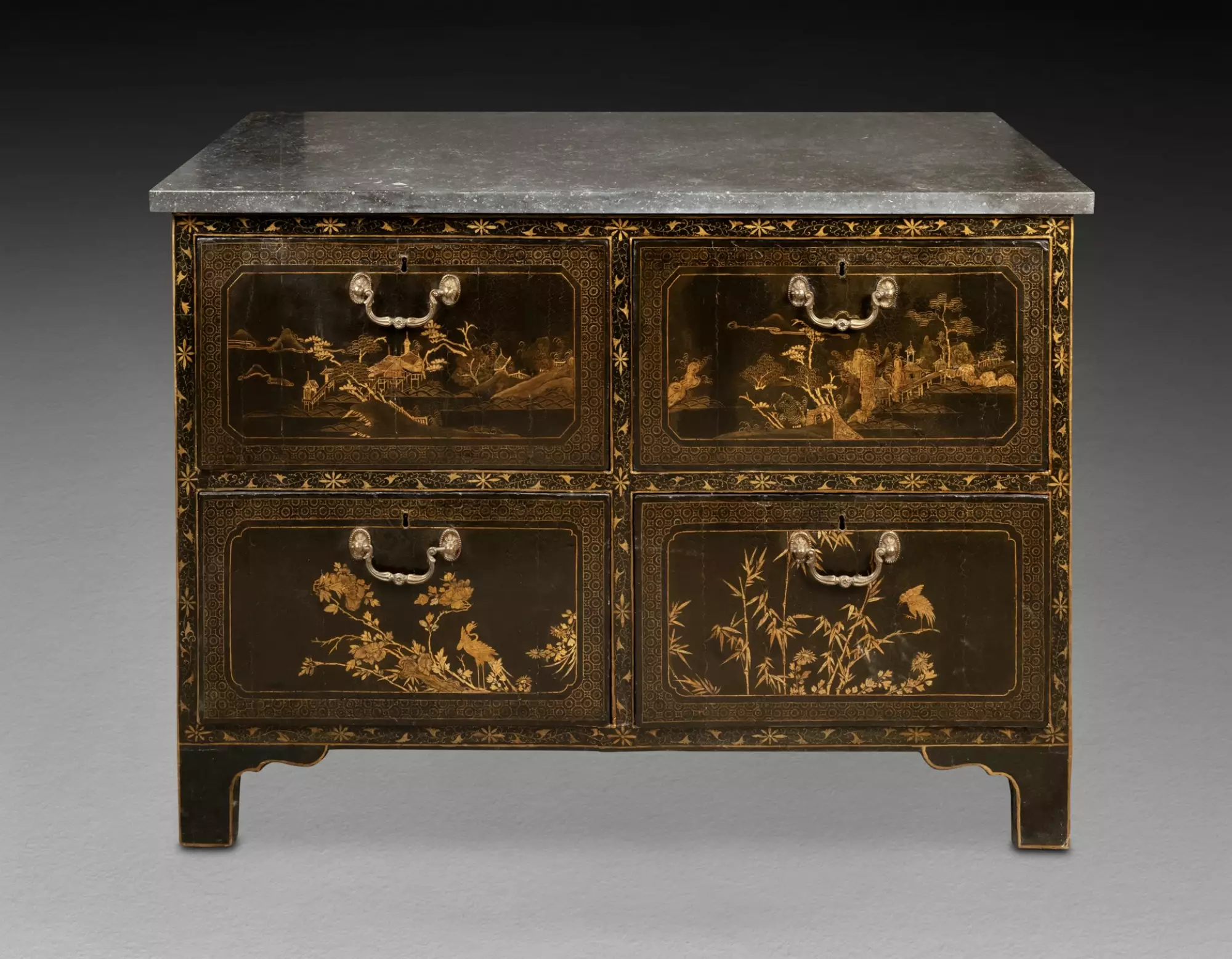 Modèle à quatre pieds droits reliés aux traverses par des écoinçons légèrement chantournés. La façade et les cotés sont entièrement plaqués de panneaux en laque, à décor à l’or sur fond noir, de paysages lacustres et de volatiles perchés dans des arbustes. Les scènes sont encadrées de motifs géométriques et les traverses arborent de délicates frises de rinceaux végétaux.