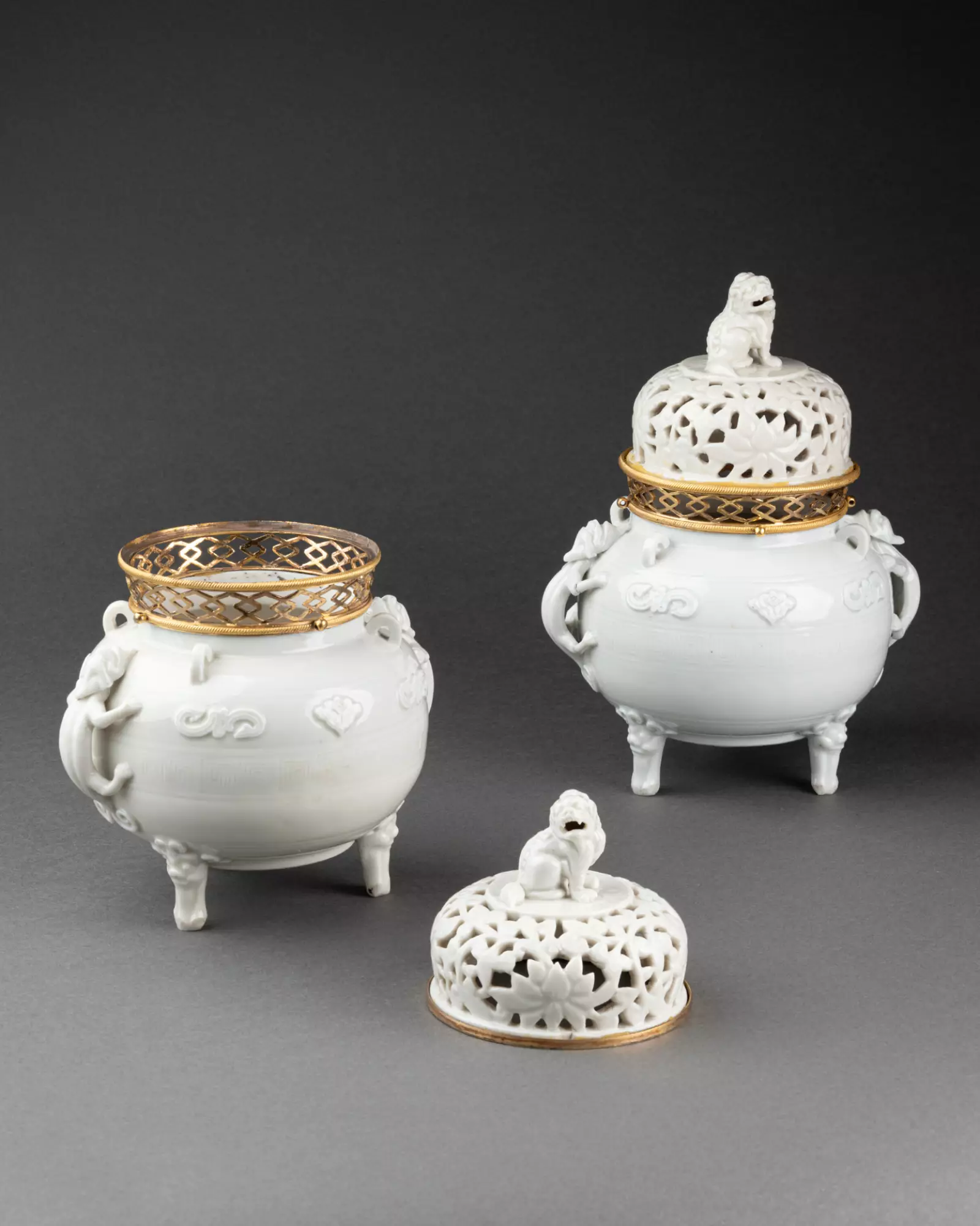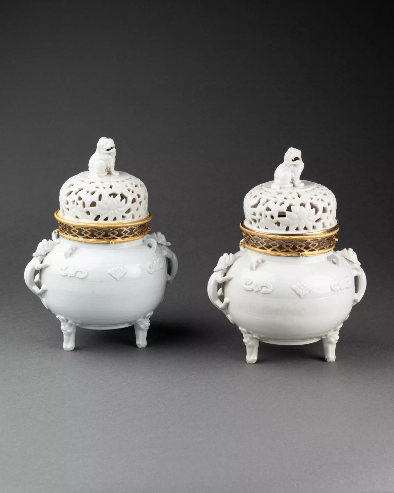 Les porcelaines, province du Fujian, fours de Dehua, règne de l’empereur Kangxi (1661–1722). La monture en bronze, à double patine et deux ors, a été réalisée à Paris vers 1780.