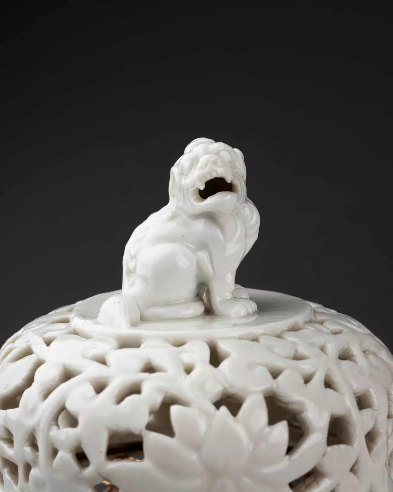 Les bouchons sont surmontés de chiens de Fô, ils sont porcelaine réticulée à décor ajouré de fleurs de lotus finement incisées.