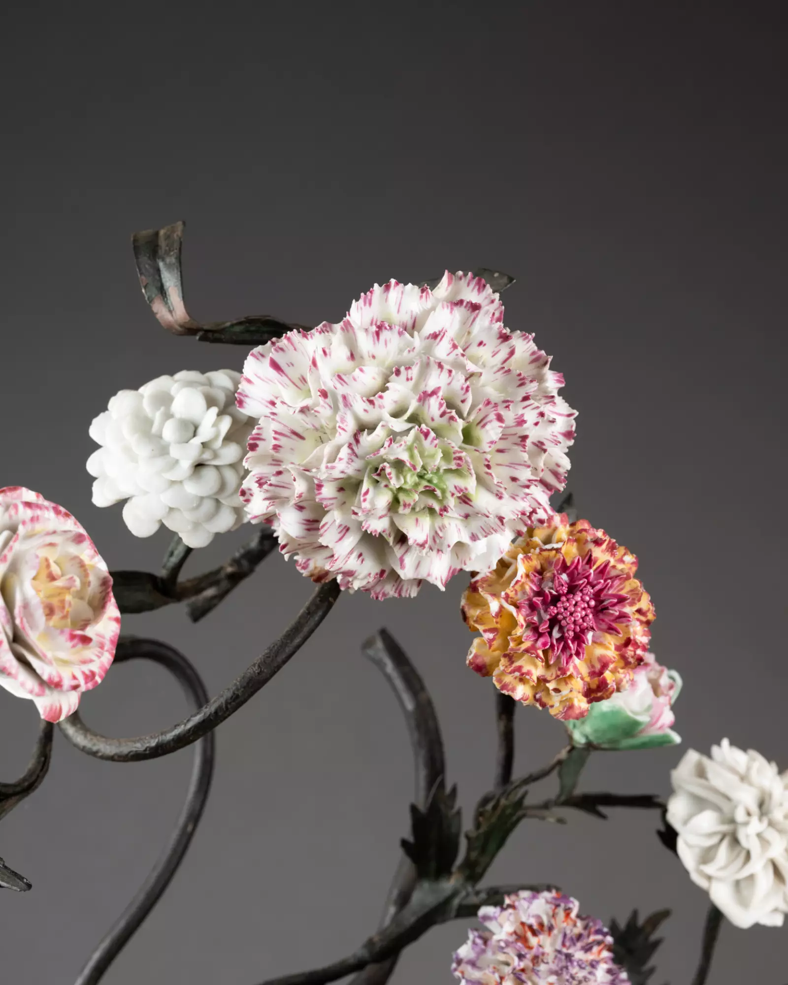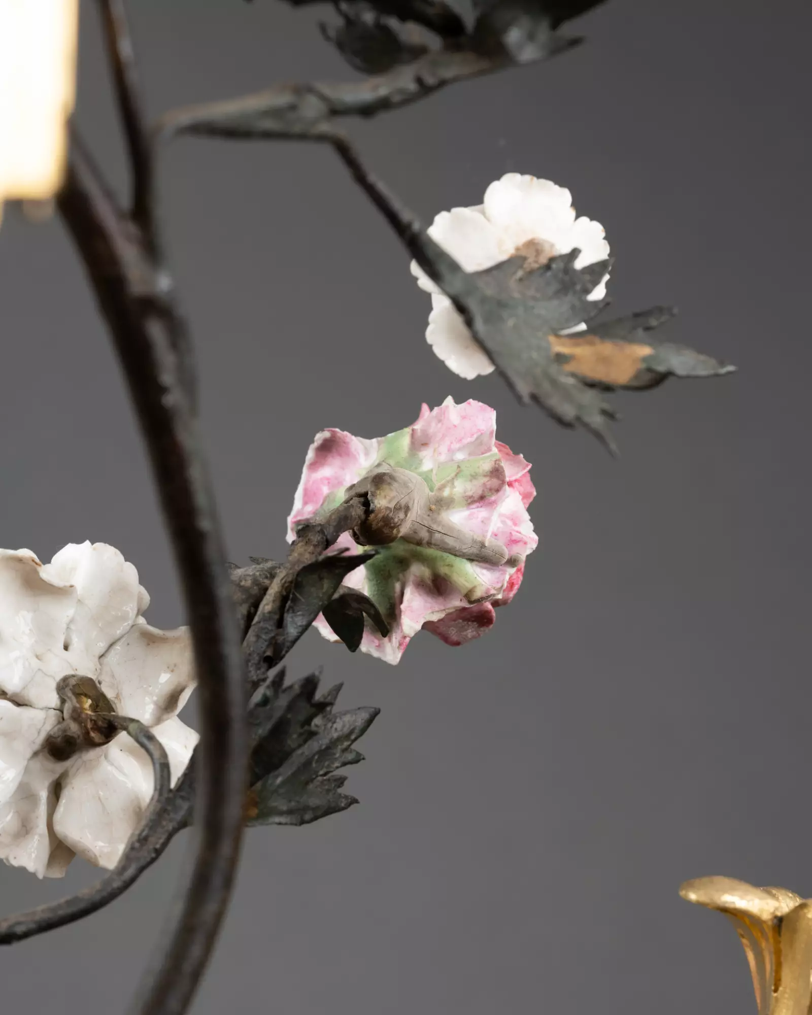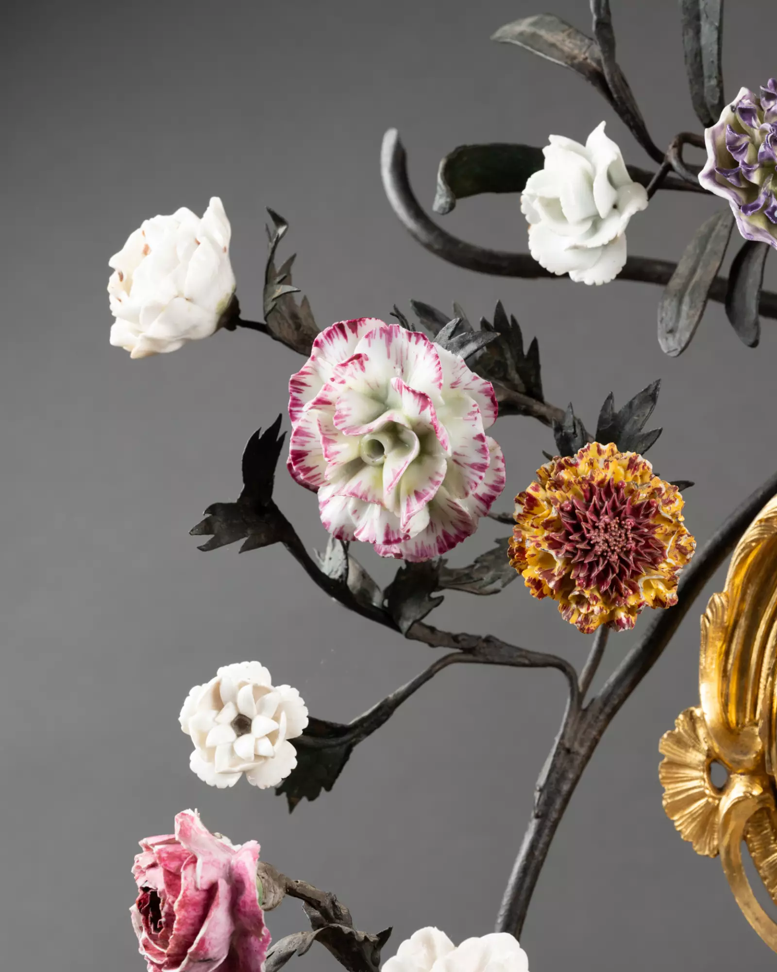 Notre pendule est une allégorie du temps qui passe et faisait office de memento mori, rappelant la fragilité de l’existence et l’inéluctable fuite du temps. Par ses dimensions monumentales (81 cm), la présence de quatre bras de lumière intégrés, l’extraordinaire profusion de plus de cinquante fleurs en porcelaine pâte tendre de Vincennes, dont certaines atteignent 7,5 cm de diamètre, ainsi que l’adjonction d’un important groupe en porcelaine de Meissen (37 cm), cette pendule constitue une réalisation d’un prestige tout à fait exceptionnel.