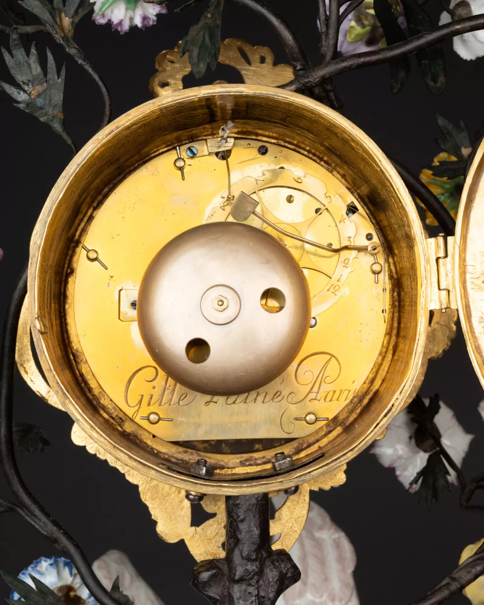 Elle est composée d’un socle rocaille en bronze ciselé, doré et ajouré sur lequel repose un grand sujet en porcelaine de Chronos, symbolisant une allégorie du temps sous les traits d’un vieillard ailé muni d’une faux. A l’arrière du socle se déploie une structure en fer forgé et tôle peinte, figurant un arbuste naturaliste aux branches sinueuses entièrement garnies de fleurs polychromes en porcelaine dont des roses, oeillets, chrysanthèmes, marguerites, renoncules, anémones… Au centre de l’arbuste, fixé sur le tronc, figure le boitier en bronze à décor d’agrafes d’acanthes qui renferme le mouvement d’horlogerie. Ce dernier est signé sur la platine arrière et sur le cadran « Gilles l’ainé à Paris ». Le cadran émaillé blanc présente des chiffres romains pour les heures et des chiffres arabes pour les minutes. Il sonne les heures et les demies.
