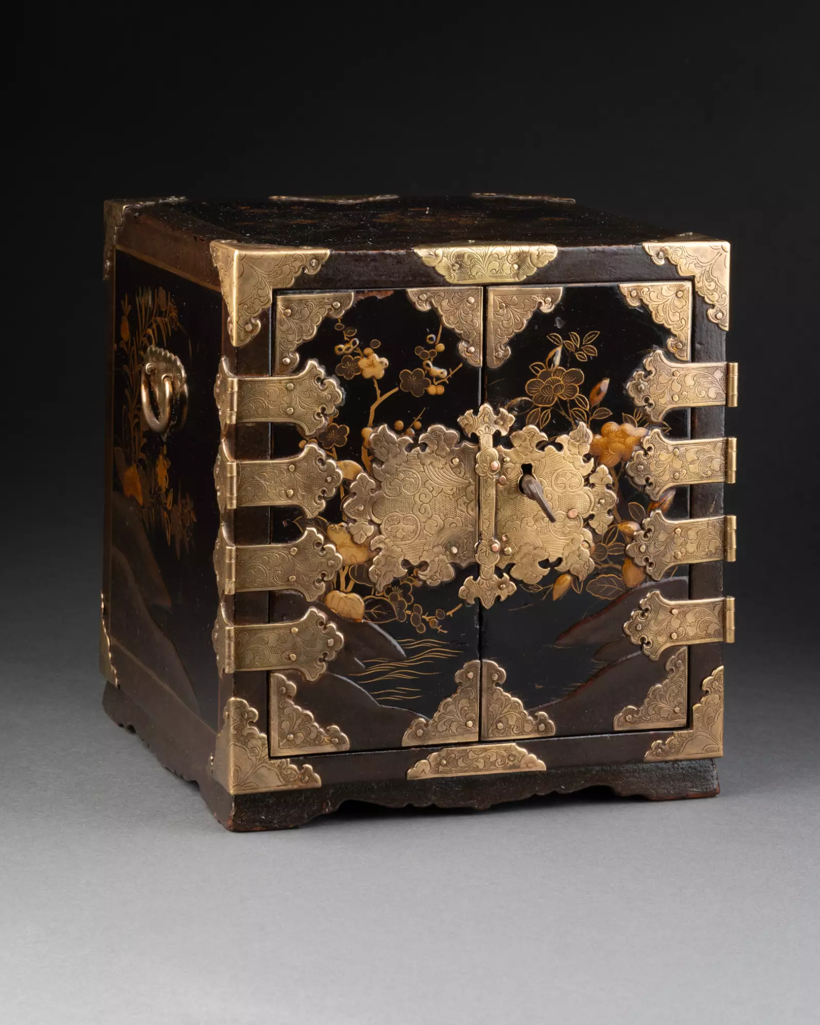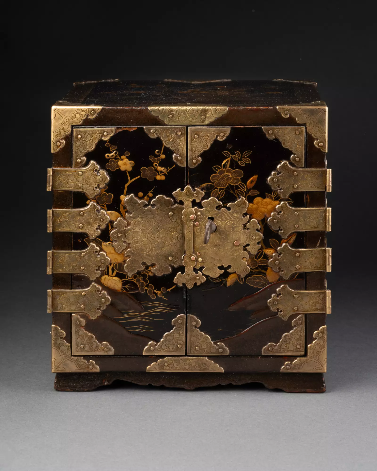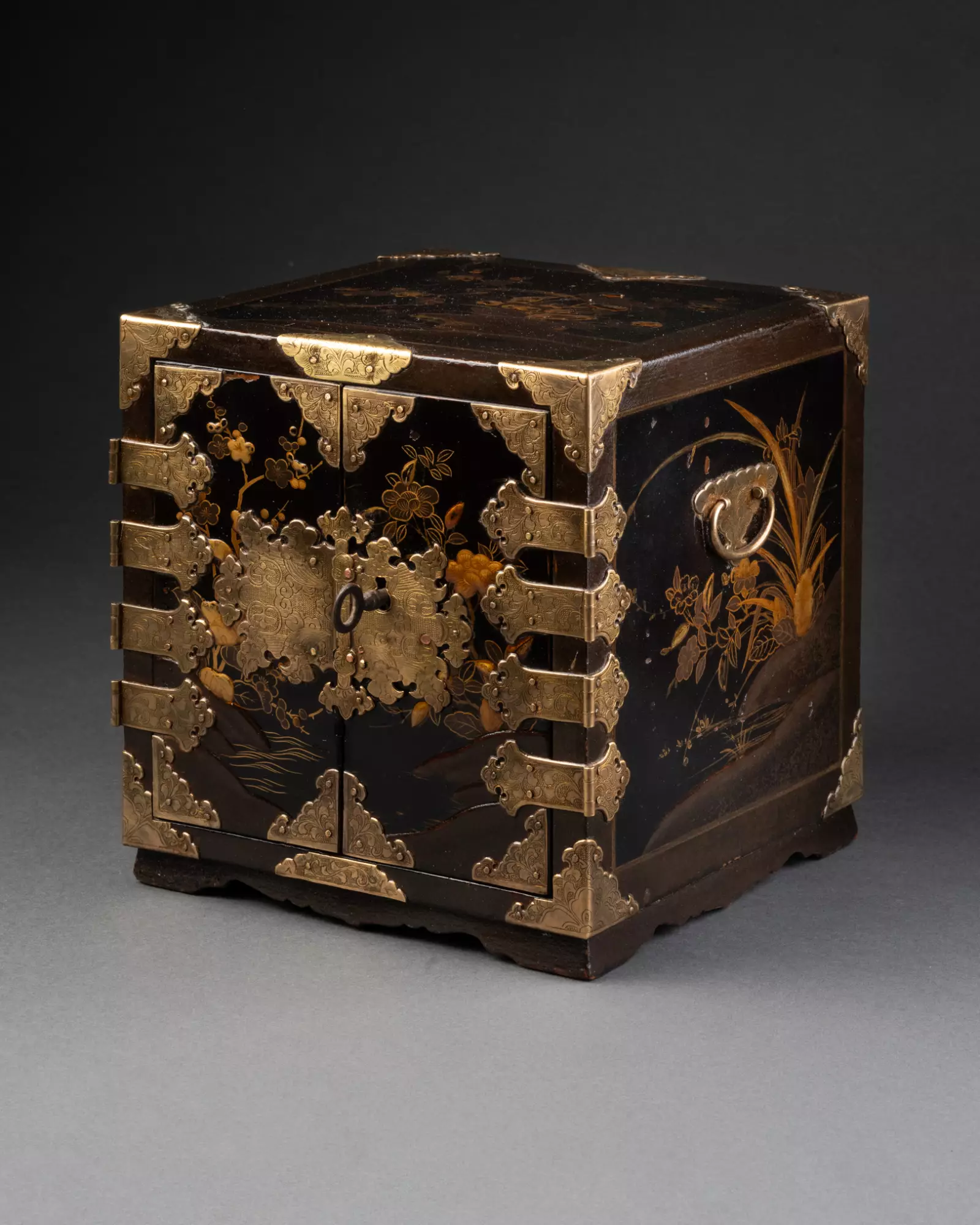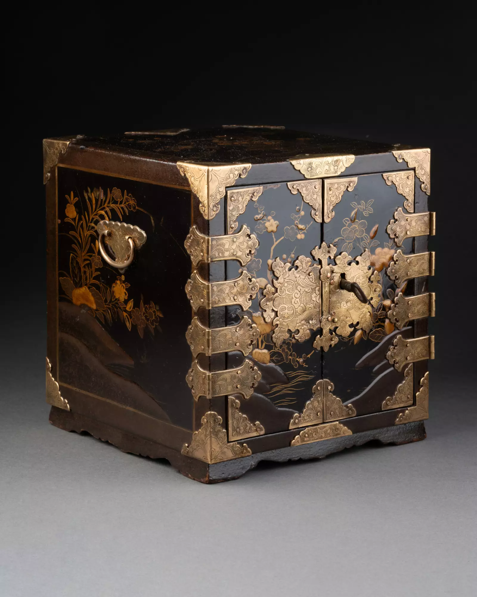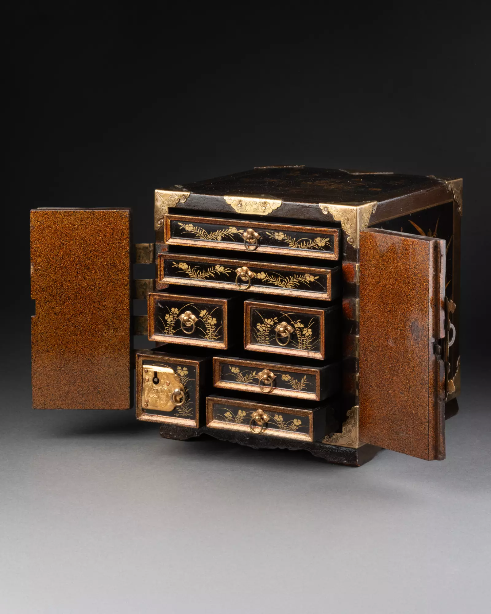 Ouvrant par deux vantaux dévoilant sept tiroirs sur cinq rangs, dont un fermant à clé. Bois laqué noir (urushi) à décors saupoudrés d’or et de cuivre (maki-e) en fort relief (takamaki-e).