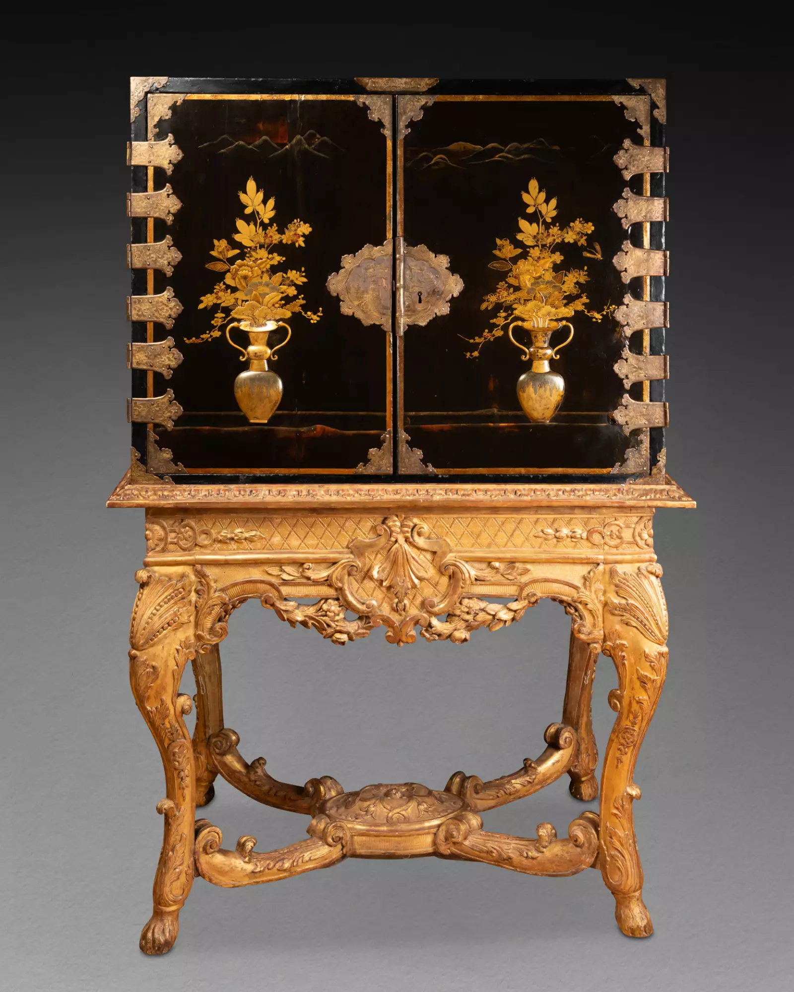 Le cabinet repose sur un piètement en bois de chêne doré à la feuille. La ceinture finement sculptée présente un décor de quadrillages et d’acanthes feuillagées, souligné de gravures dans les apprêts. Les pieds galbés se terminent par des sabots de cervidés, reliés par une entretoise mouvementée ornée d’enroulements et de rinceaux.