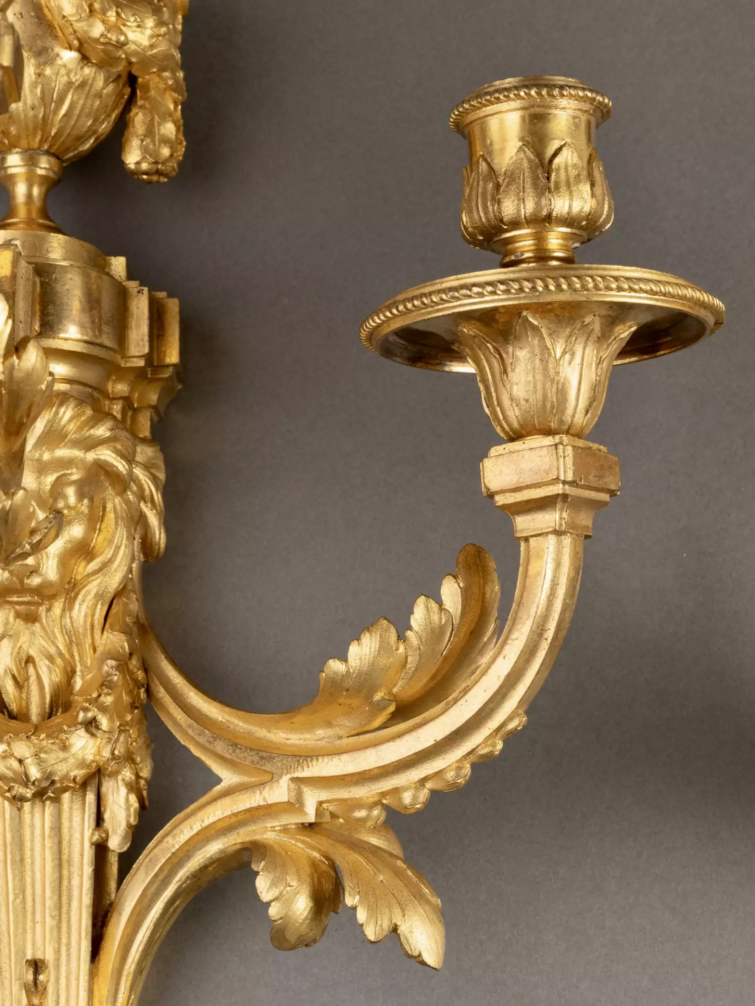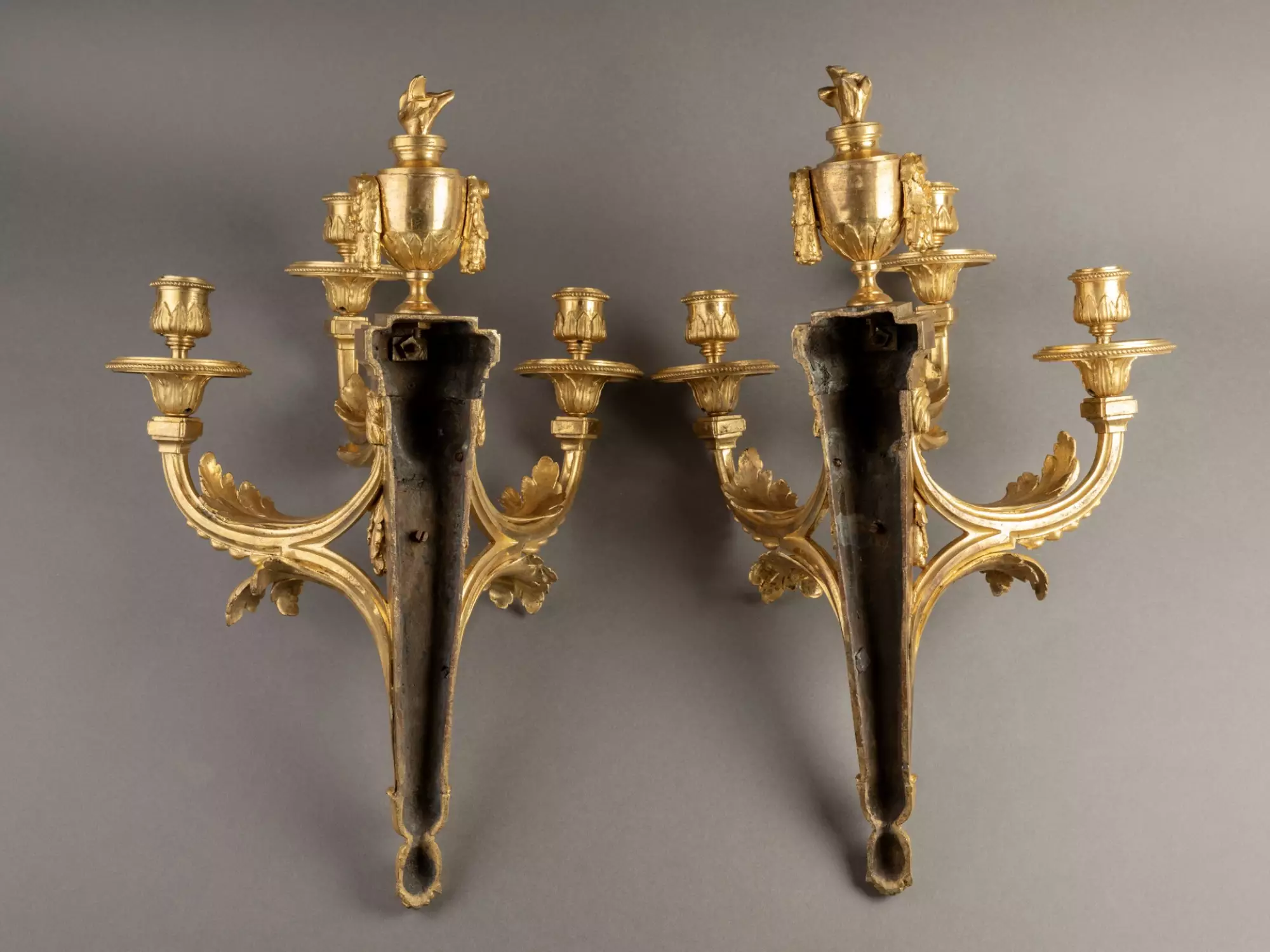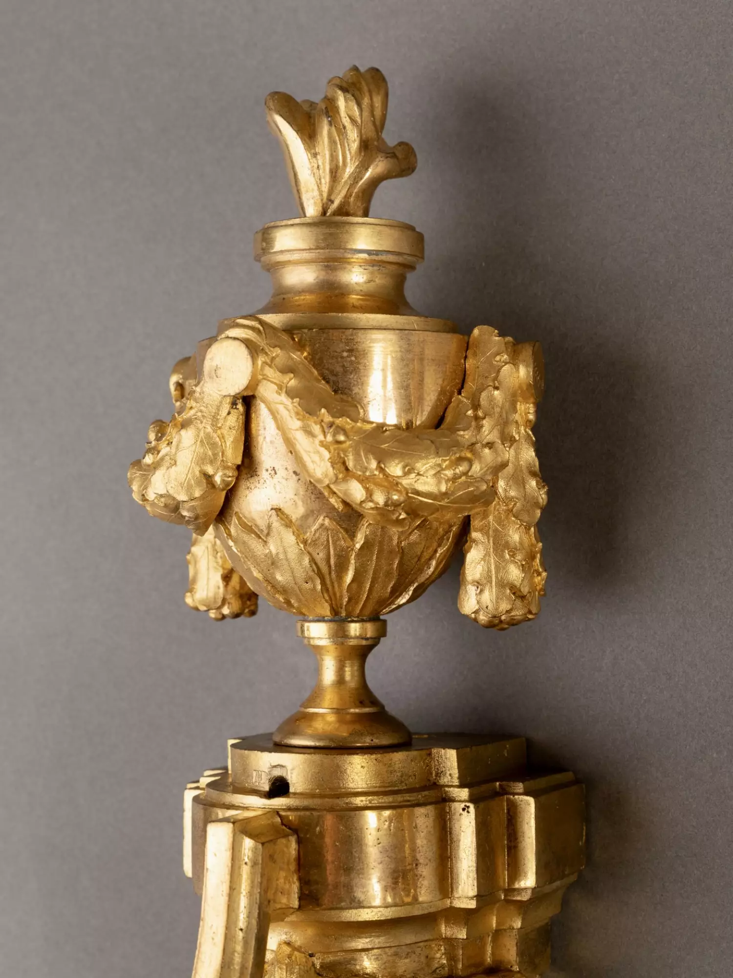 Les parties hautes sont surmontées de pots à feu à l’antique. Les trois bras de lumières qui sont en forme de volutes soulignées de rinceaux d’acanthes supportent des coupelles et des bobèches à culots de palmettes.