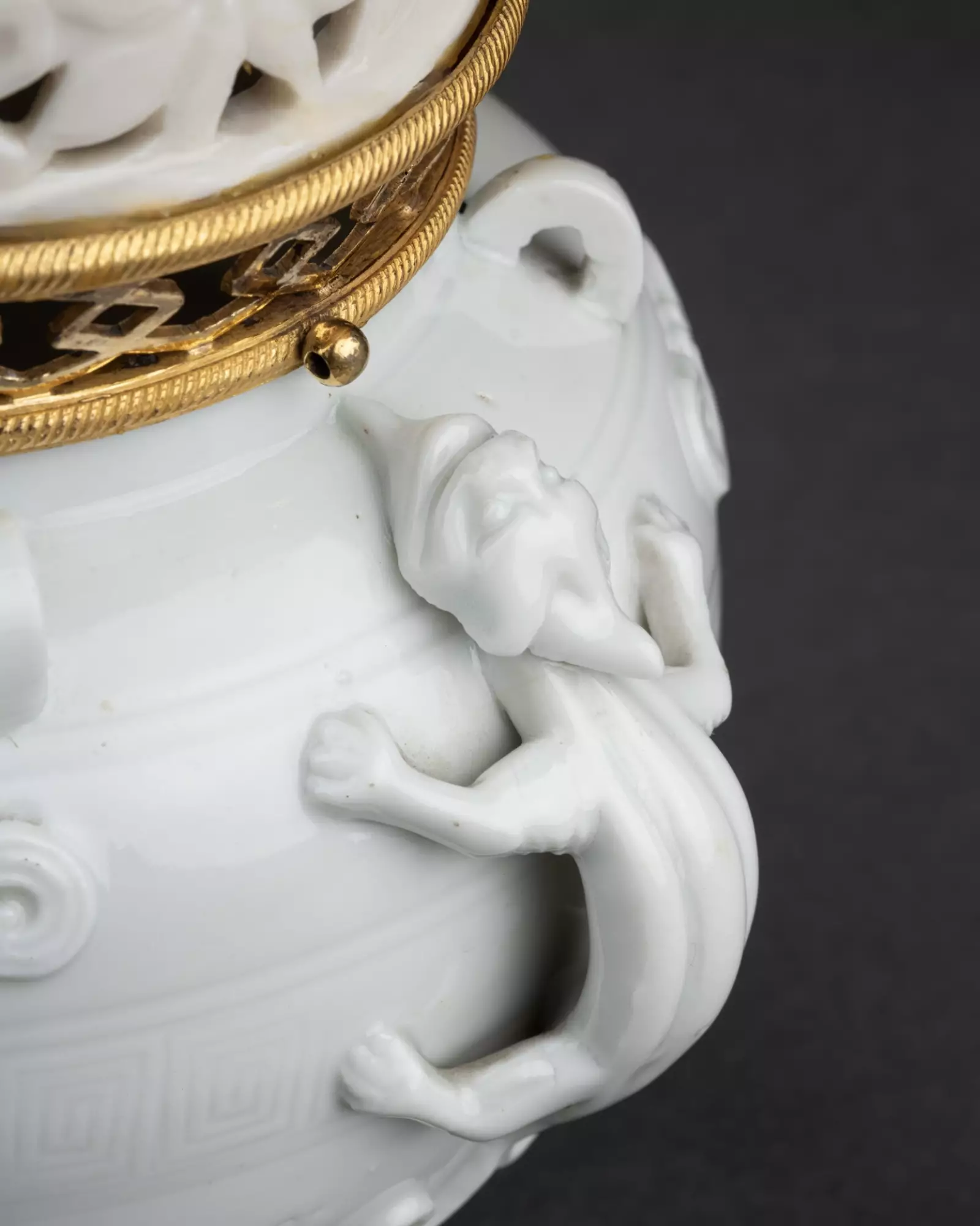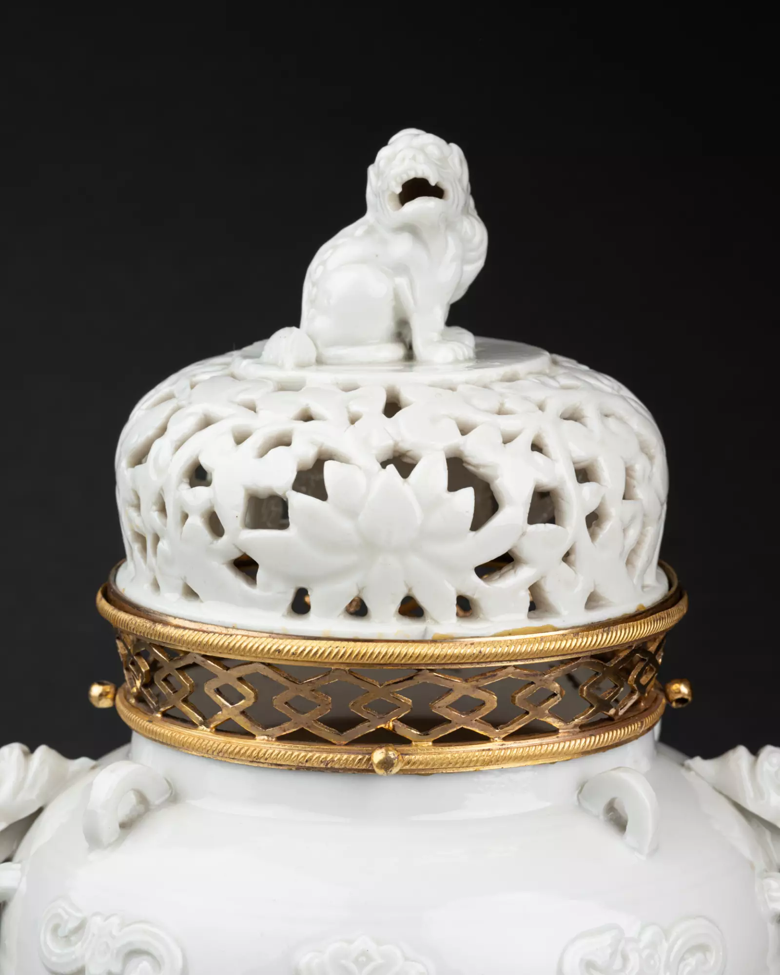?Rare paire de pots-pourris en porcelaine blanc de Chine et bronze finement ciselé et doré au mercure.