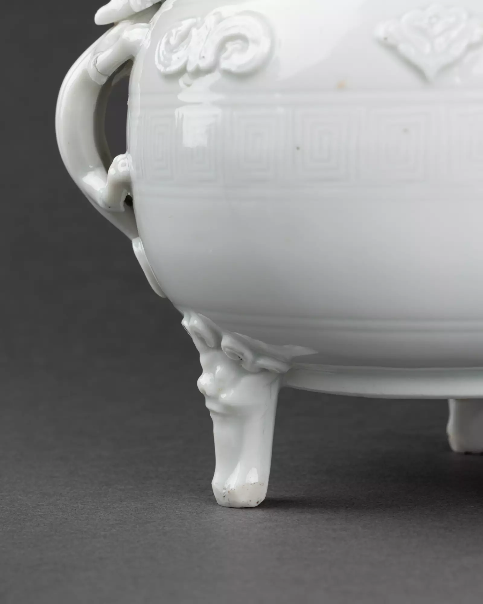 Un brûle-parfum très proche est présenté dans l’ouvrage cité ci-dessus, où il fait l’objet d’une analyse détaillée, accompagnée d’une étude approfondie de l’iconographie du dragon chi. Celle-ci confirme, sans ambiguïté, l’attribution de ce type de production aux fours de Dehua. Les caractéristiques formelles du motif, corps modelé d’un seul tenant, traitement en ronde-bosse ou en léger relief et l'élégance du modelé, correspondent parfaitement aux productions identifiées de ce centre.