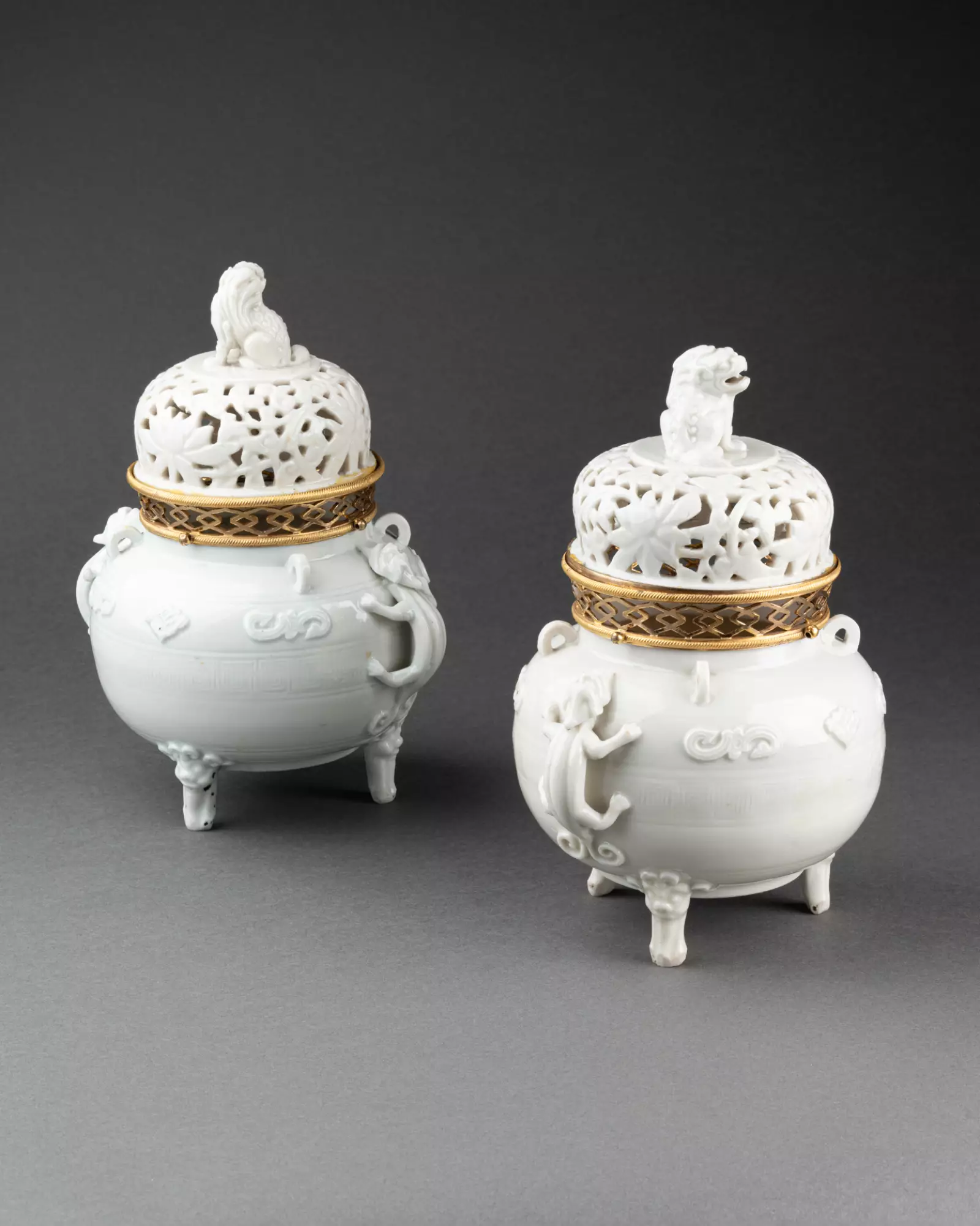 Les porcelaines, province du Fujian, fours de Dehua, règne de l’empereur Kangxi (1661–1722). La monture en bronze, à double patine et deux ors, a été réalisée à Paris vers 1780.