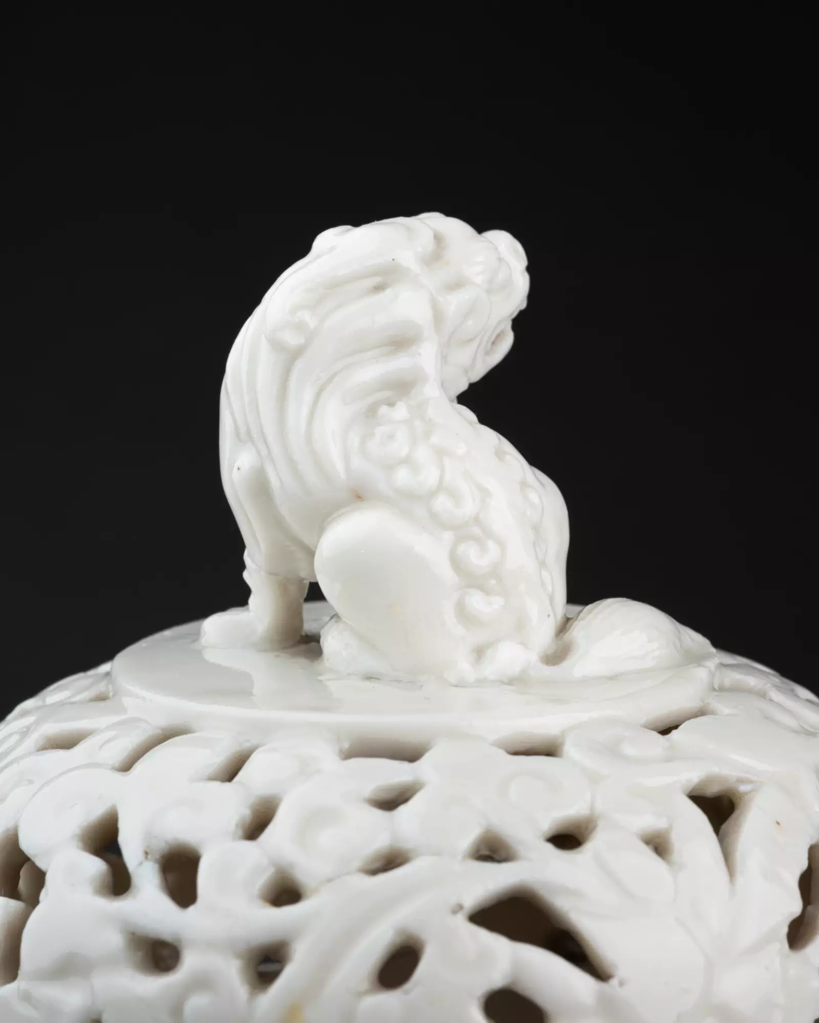 Les bouchons sont surmontés de chiens de Fô, ils sont porcelaine réticulée à décor ajouré de fleurs de lotus finement incisées.