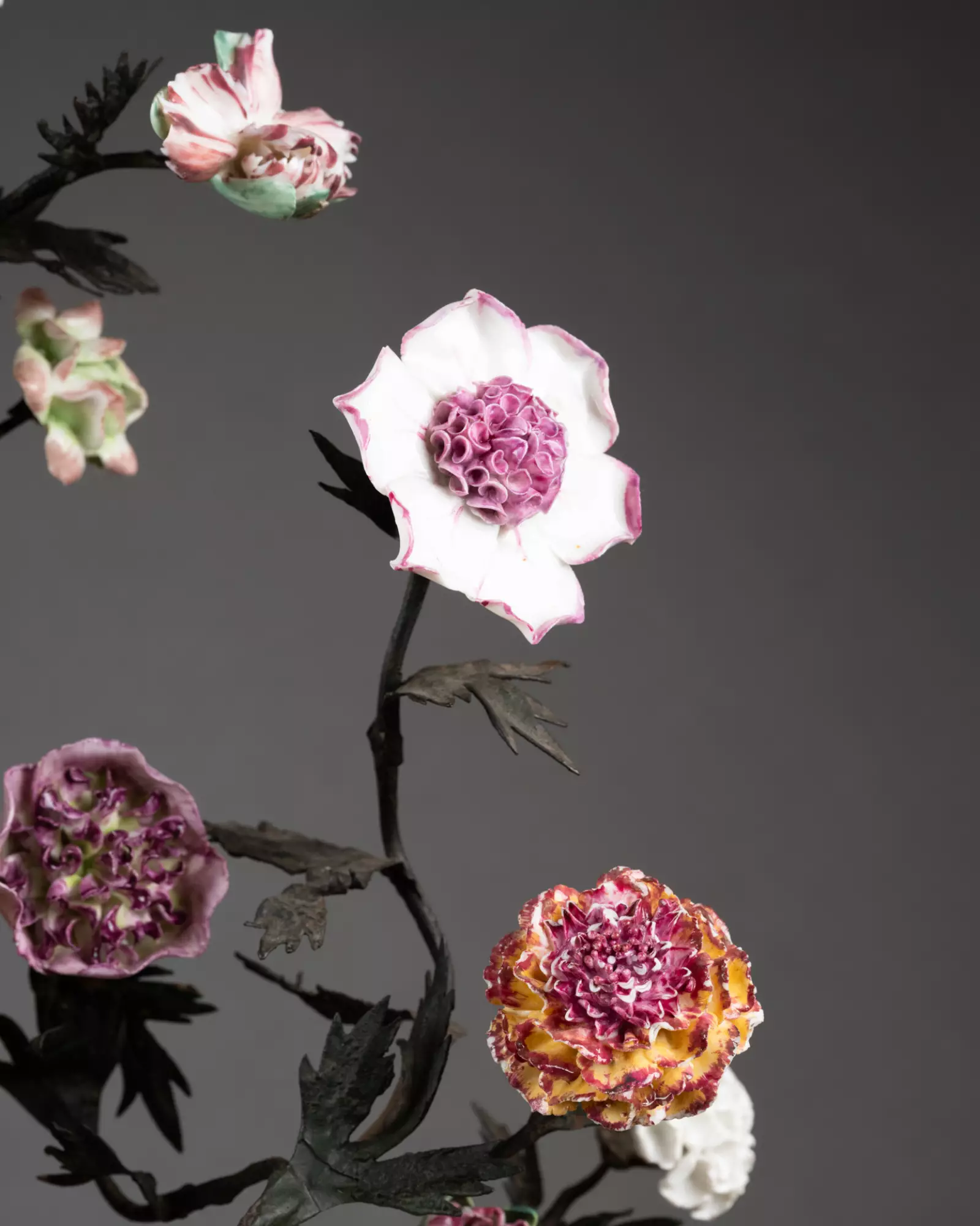 Les fleurs en porcelaine pâte tendre sont attribuables à la « fleurisserie » de la manufacture de Vincennes.