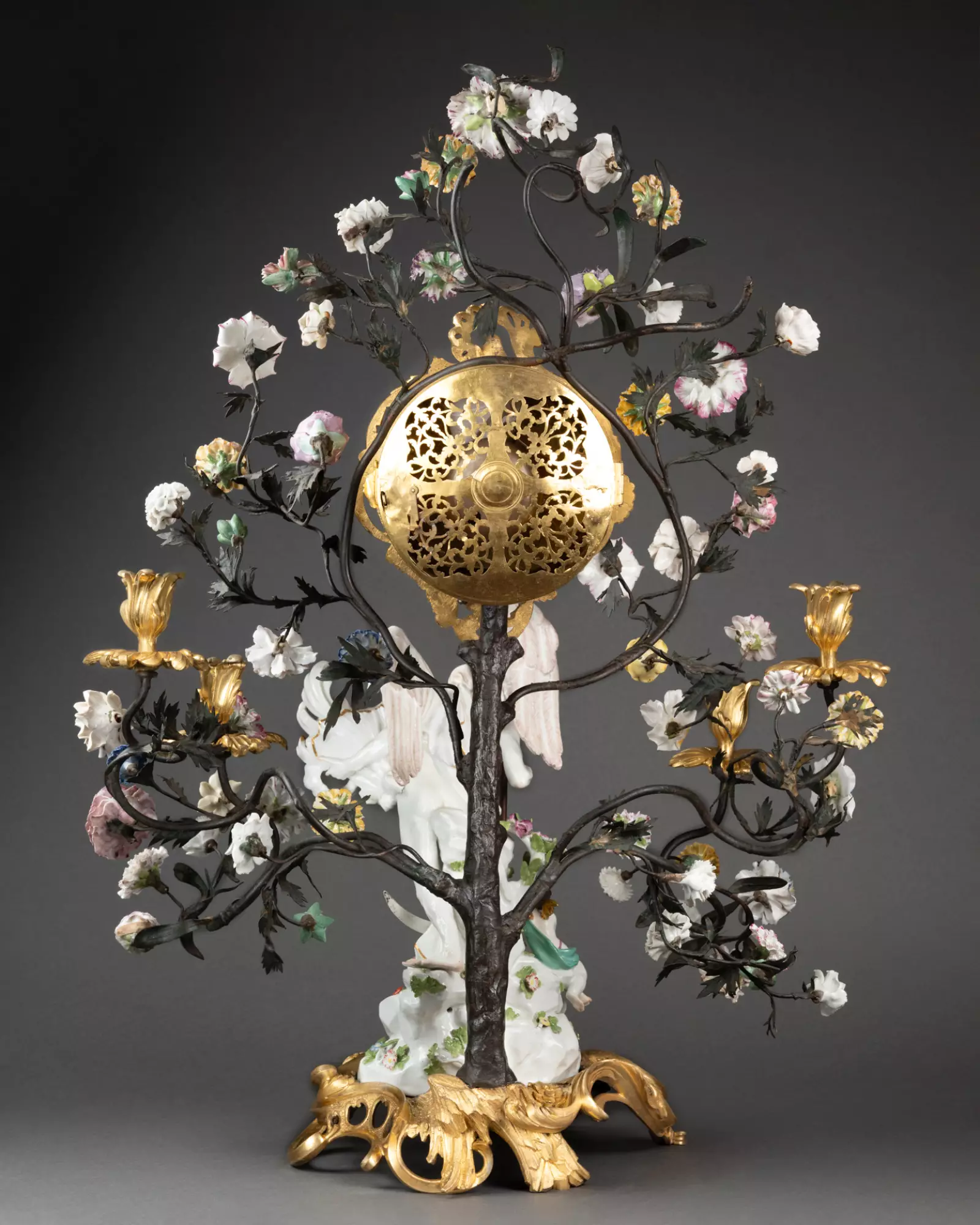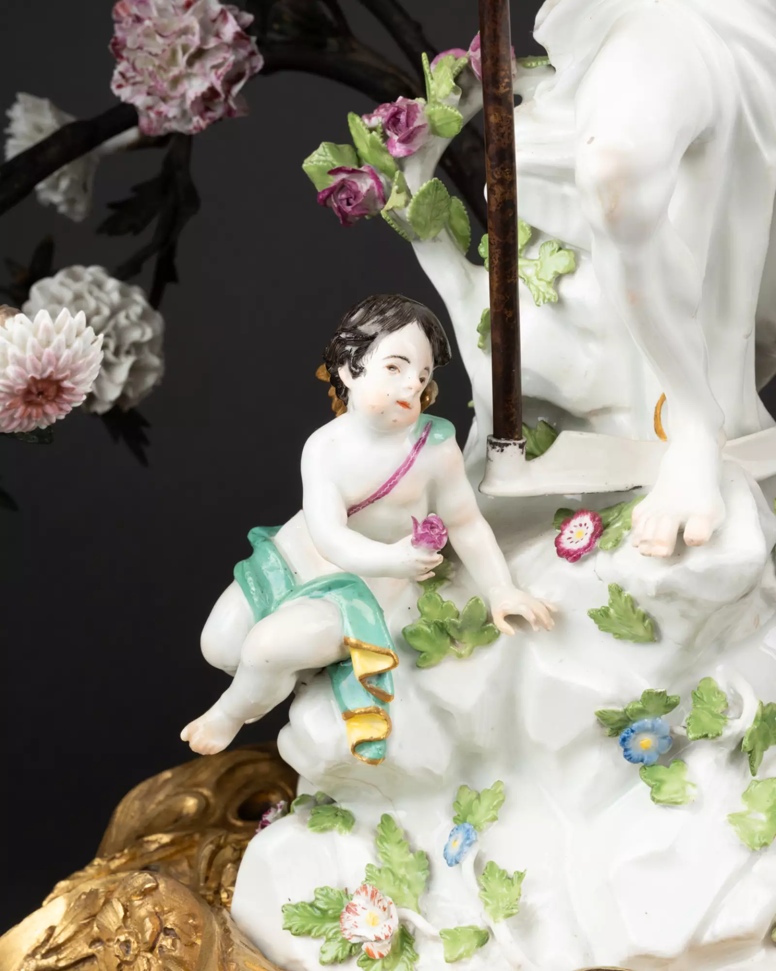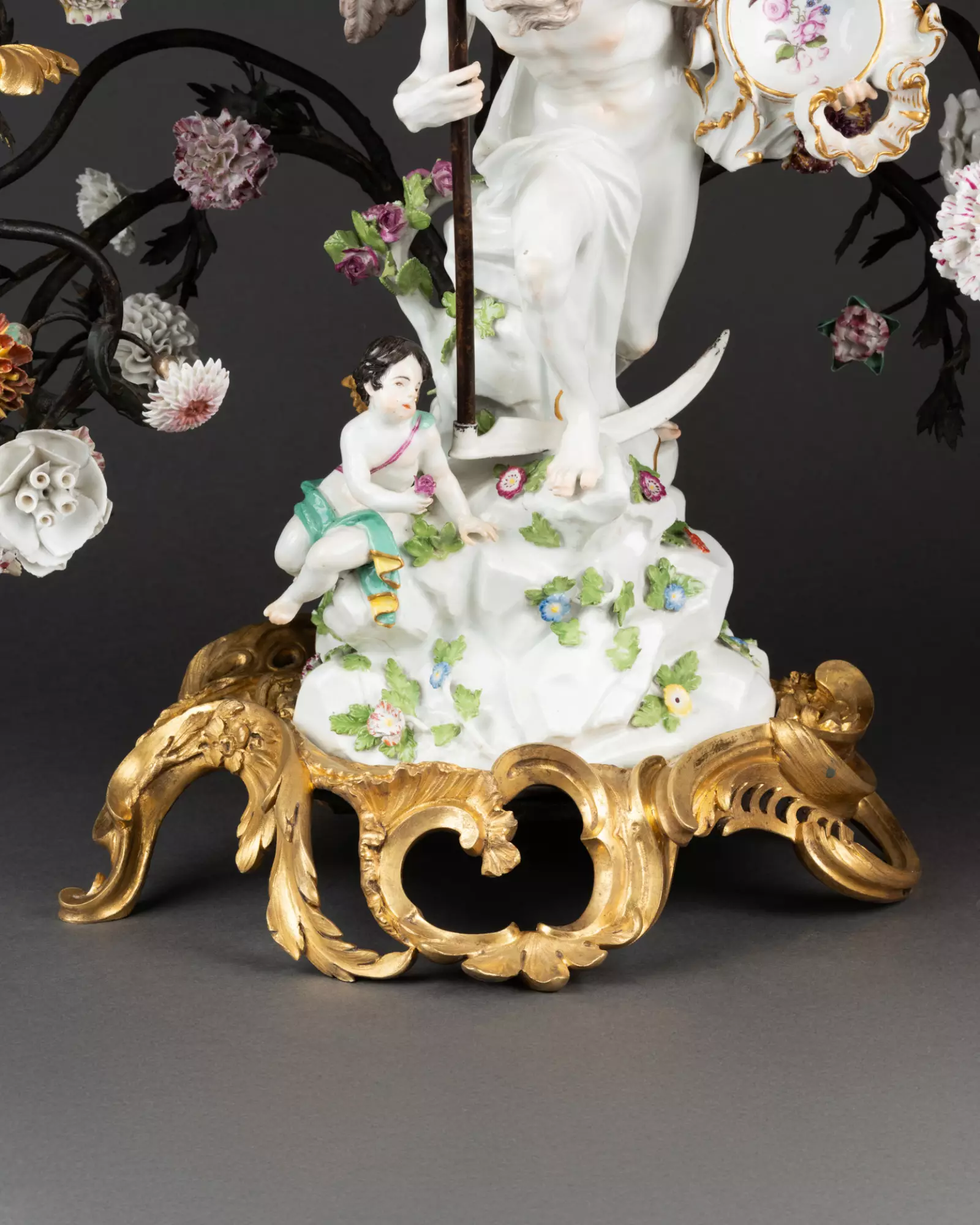 L’important sujet de Chronos (37 cm) en porcelaine de Meissen, est attribuable au sculpteur-modeleur Johann Joachim Kaëndler (1706-1771) ; il est mentionné dans les registres de l’année 1747. Ce sujet fût probablement conçu à l’origine comme un porte-montre pour recevoir le mouvement dans le médaillon présenté par Chronos. Un exemplaire similaire était présent dans la collection René Fribourg (sa vente, Sotheby’s New York Octobre 1963). D’autres exemplaires sont conservés dans les collections de Burghley House, au musée de Seattle ou encore au Landesmuseum Wurttemberg de Stuttgart.