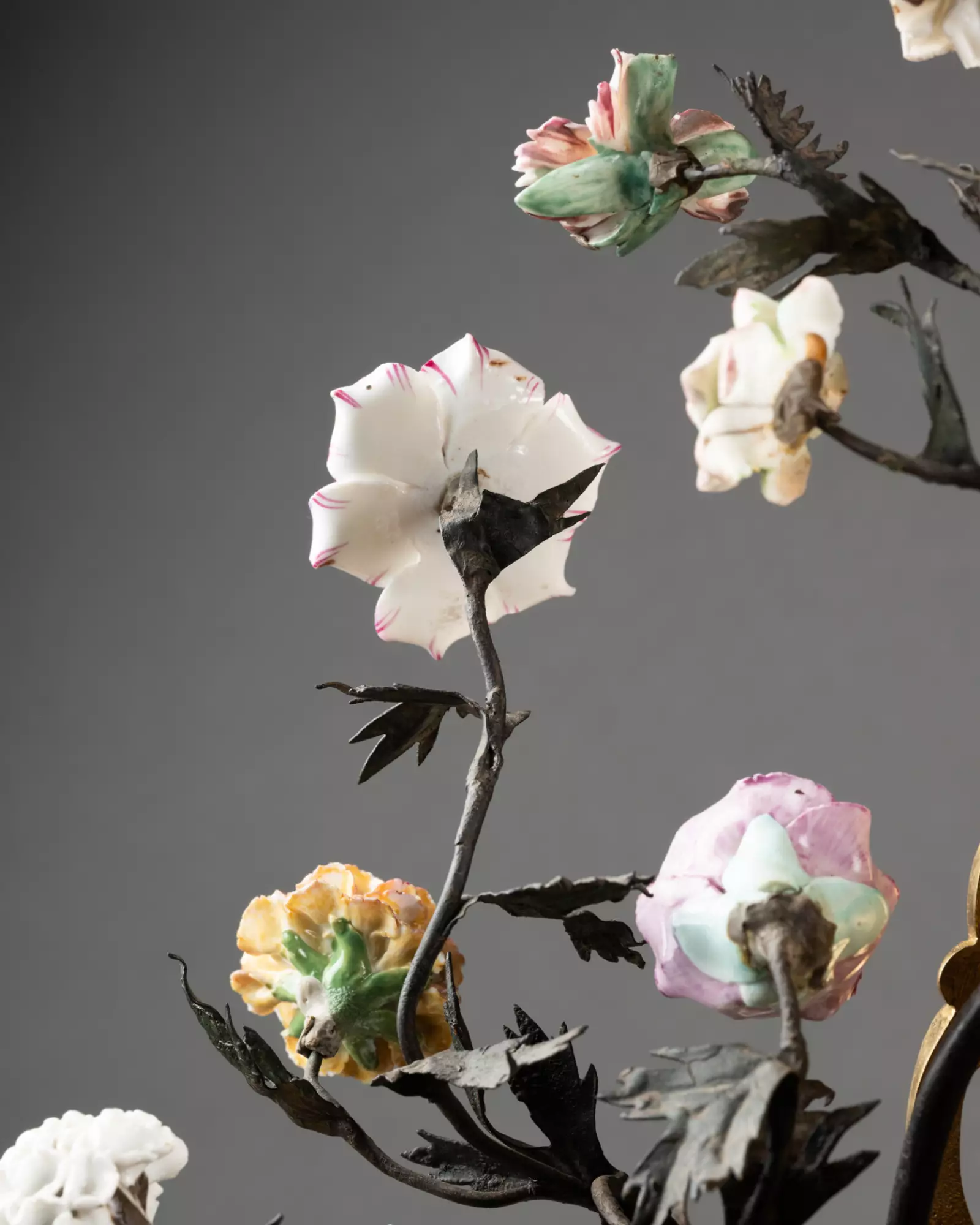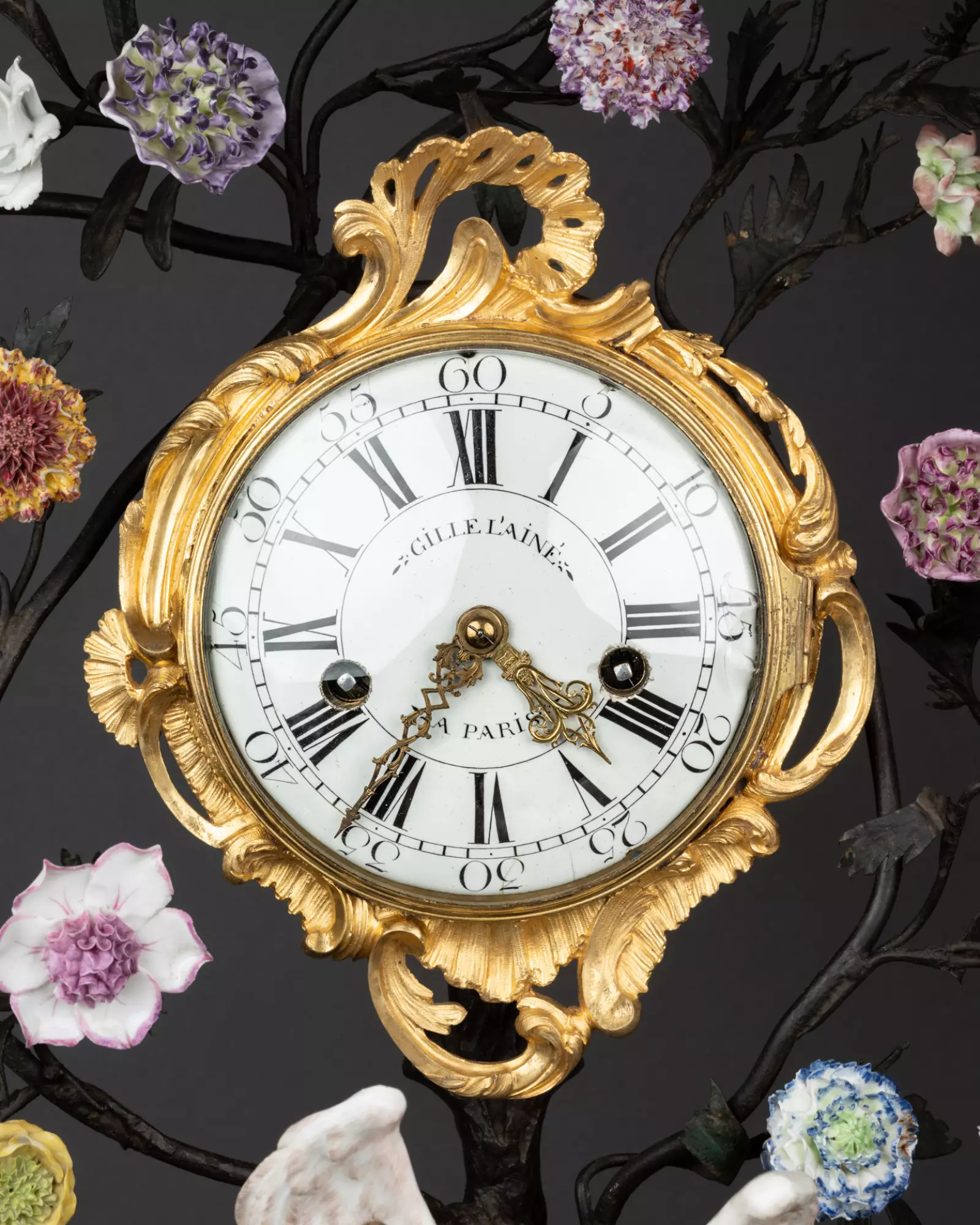 Notre pendule est une allégorie du temps qui passe et faisait office de memento mori, rappelant la fragilité de l’existence et l’inéluctable fuite du temps. Par ses dimensions monumentales (81 cm), la présence de quatre bras de lumière intégrés, l’extraordinaire profusion de plus de cinquante fleurs en porcelaine pâte tendre de Vincennes, dont certaines atteignent 7,5 cm de diamètre, ainsi que l’adjonction d’un important groupe en porcelaine de Meissen (37 cm), cette pendule constitue une réalisation d’un prestige tout à fait exceptionnel.