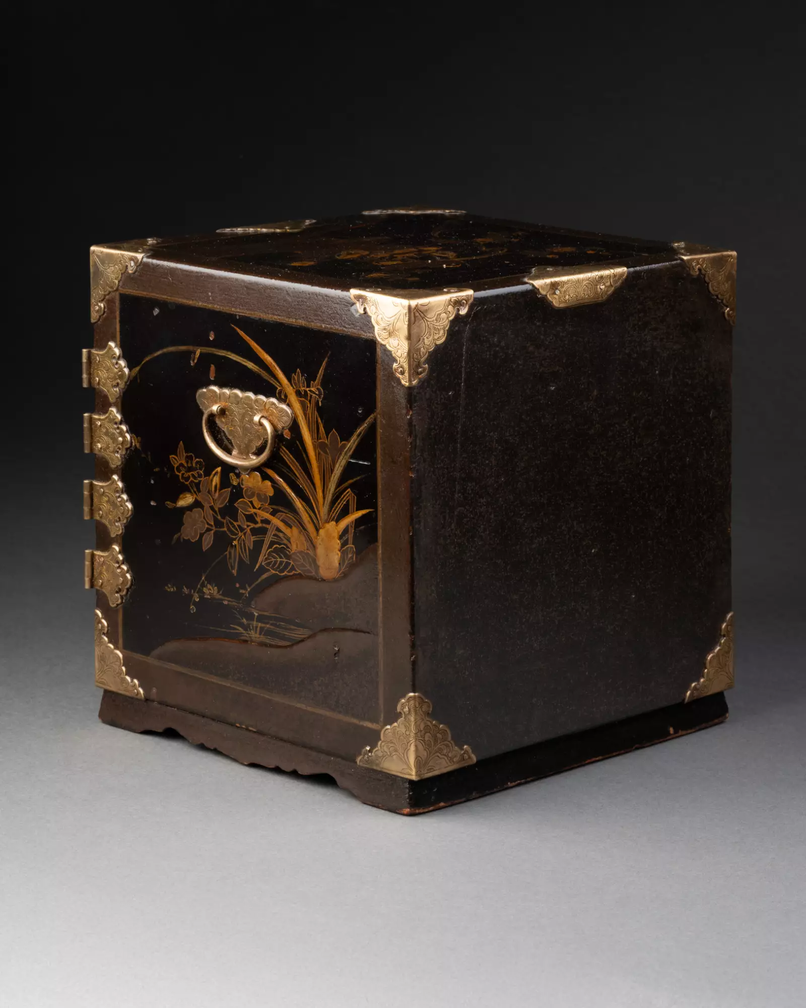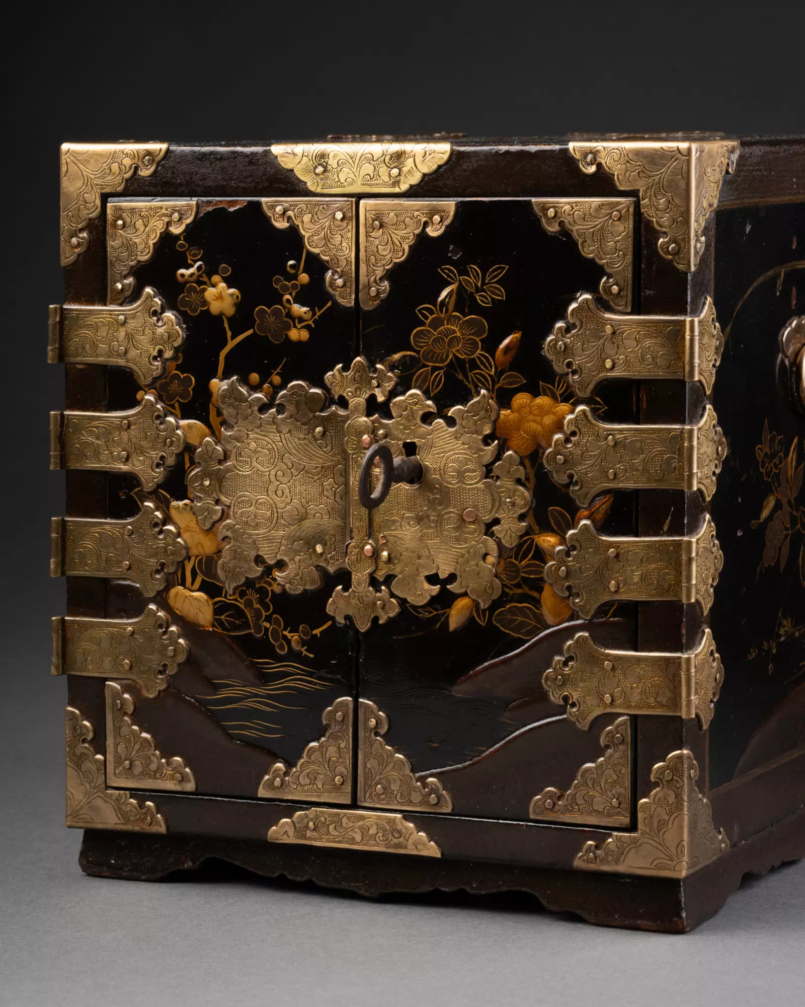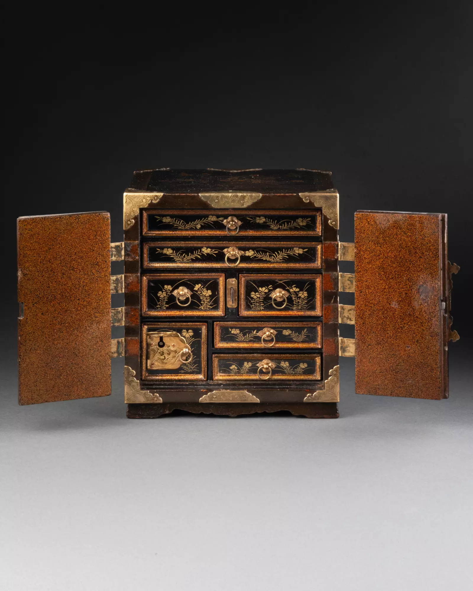 Ouvrant par deux vantaux dévoilant sept tiroirs sur cinq rangs, dont un fermant à clé. Bois laqué noir (urushi) à décors saupoudrés d’or et de cuivre (maki-e) en fort relief (takamaki-e).