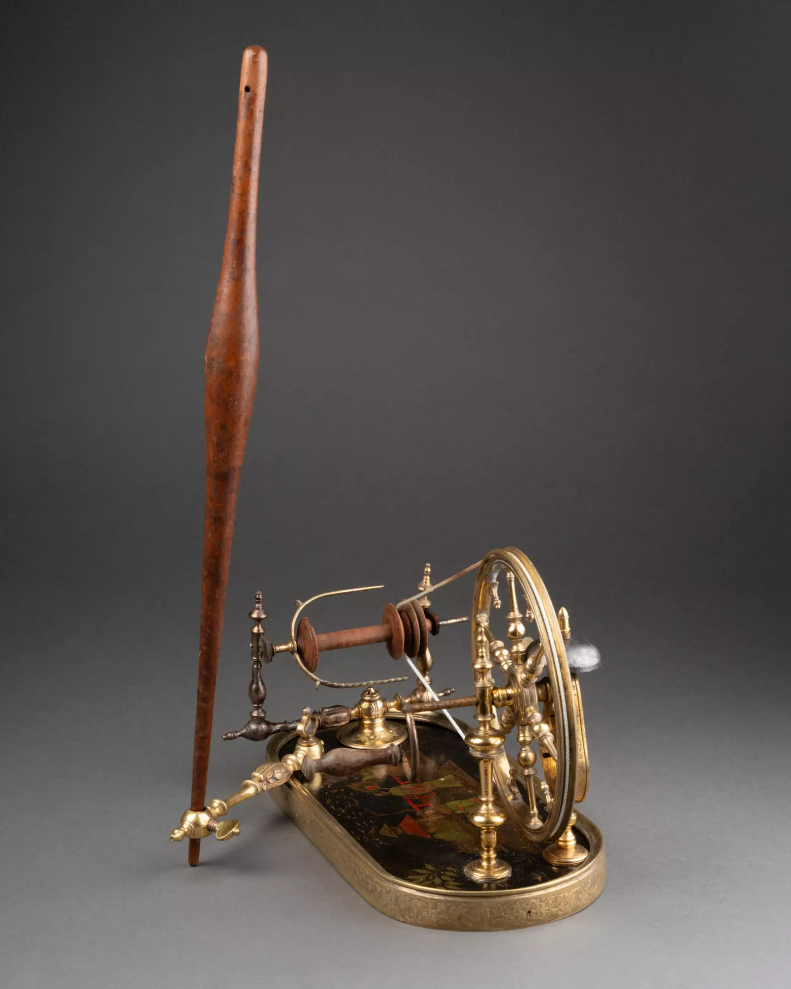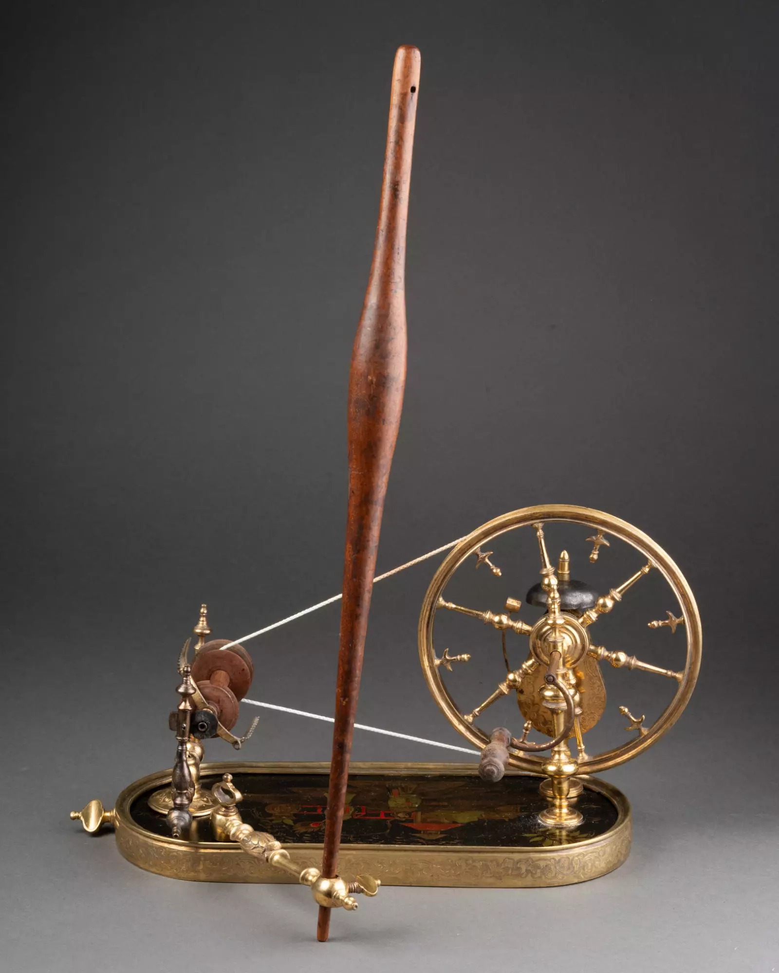Positionné sur les genoux, ce type de rouet miniature permettait de filer la soie tranquillement dans son salon lors des longues soirées d’hiver.